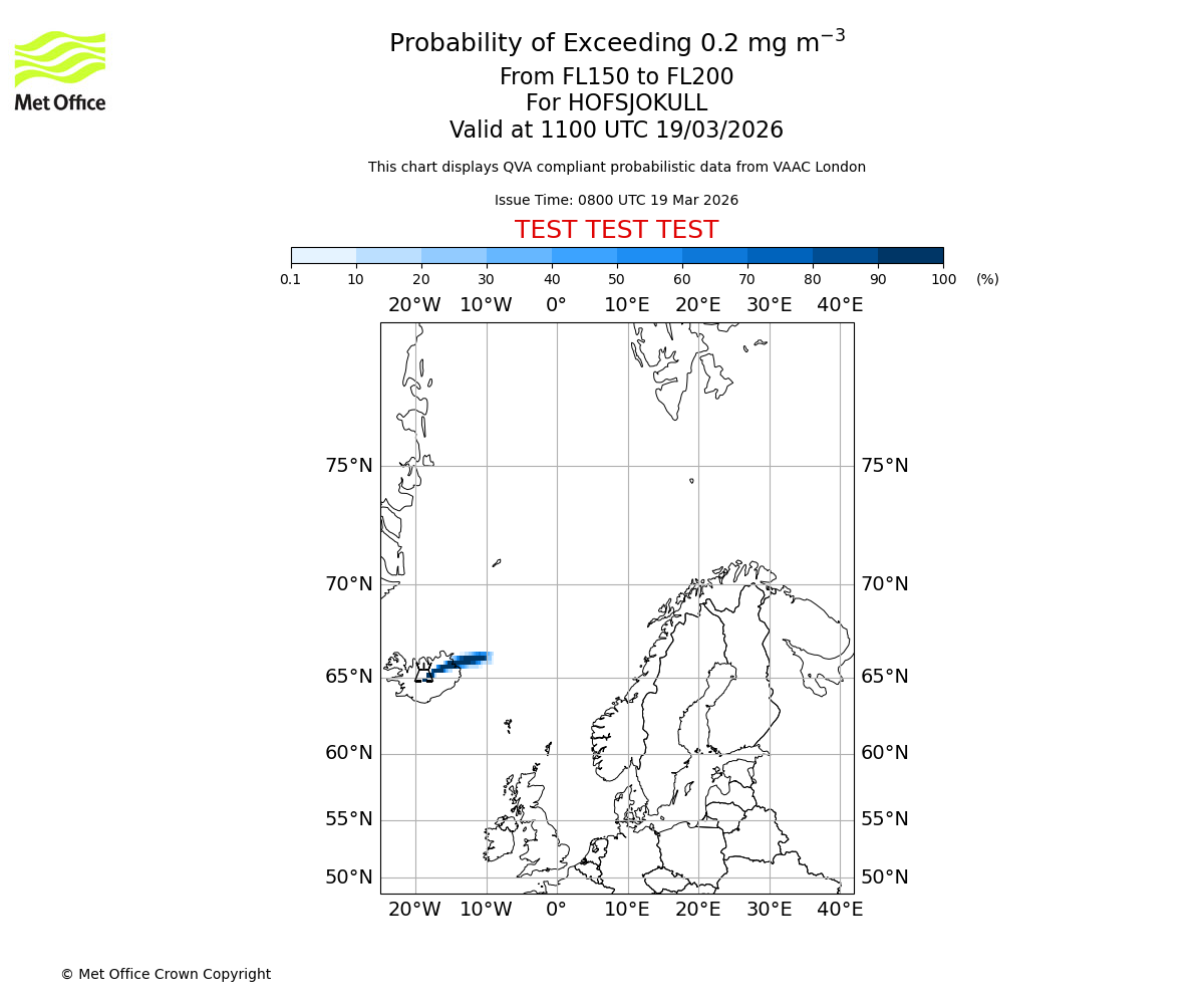 Probability of exceeding 0.2 milligrams per metre cubed. From 150 to 200 for HOFSJOKULL. Valid at 0800 UTC 19/03/2026