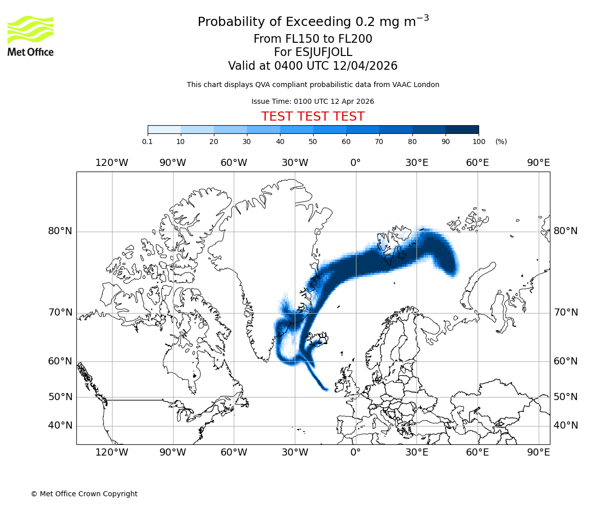 Quantitative Volcanic Ash charts (QVA) are produced in accordance with International Civil Aviation Organization (ICAO) Annex 3 requirements and are provided as well as the London Volcanic Ash Advisory Graphics (VAG) and Advisories (VAA). The lowest QVA threshold (0.2 mg/m³) matches to the areas depicted in the VAA and VAG. Both expected ash concentration and probabilistic forecast information is provided in the chart viewer below for eruptions occurring in the London Volcanic Ash Advisory Centre (VAAC) area of responsibility.