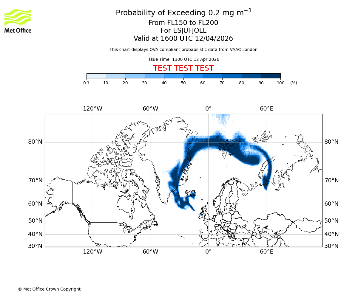 Quantitative Volcanic Ash charts (QVA) are produced in accordance with International Civil Aviation Organization (ICAO) Annex 3 requirements and are provided as well as the London Volcanic Ash Advisory Graphics (VAG) and Advisories (VAA). The lowest QVA threshold (0.2 mg/m³) matches to the areas depicted in the VAA and VAG. Both expected ash concentration and probabilistic forecast information is provided in the chart viewer below for eruptions occurring in the London Volcanic Ash Advisory Centre (VAAC) area of responsibility.