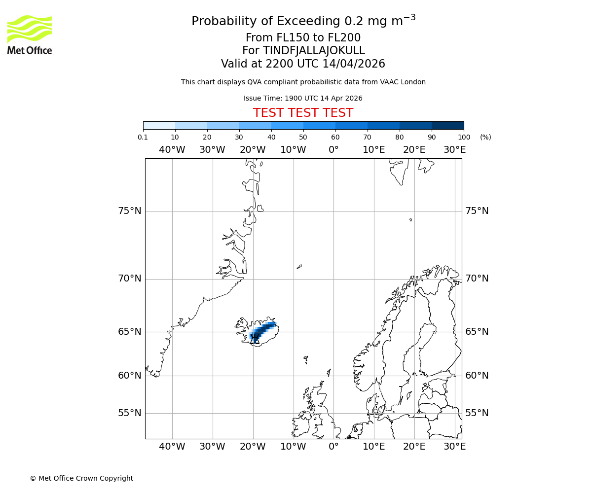 Probability of exceeding 0.2 milligrams per metre cubed. From 150 to 200 for TINDFJALLAJOKULL. Valid at 1900 UTC 14/04/2026