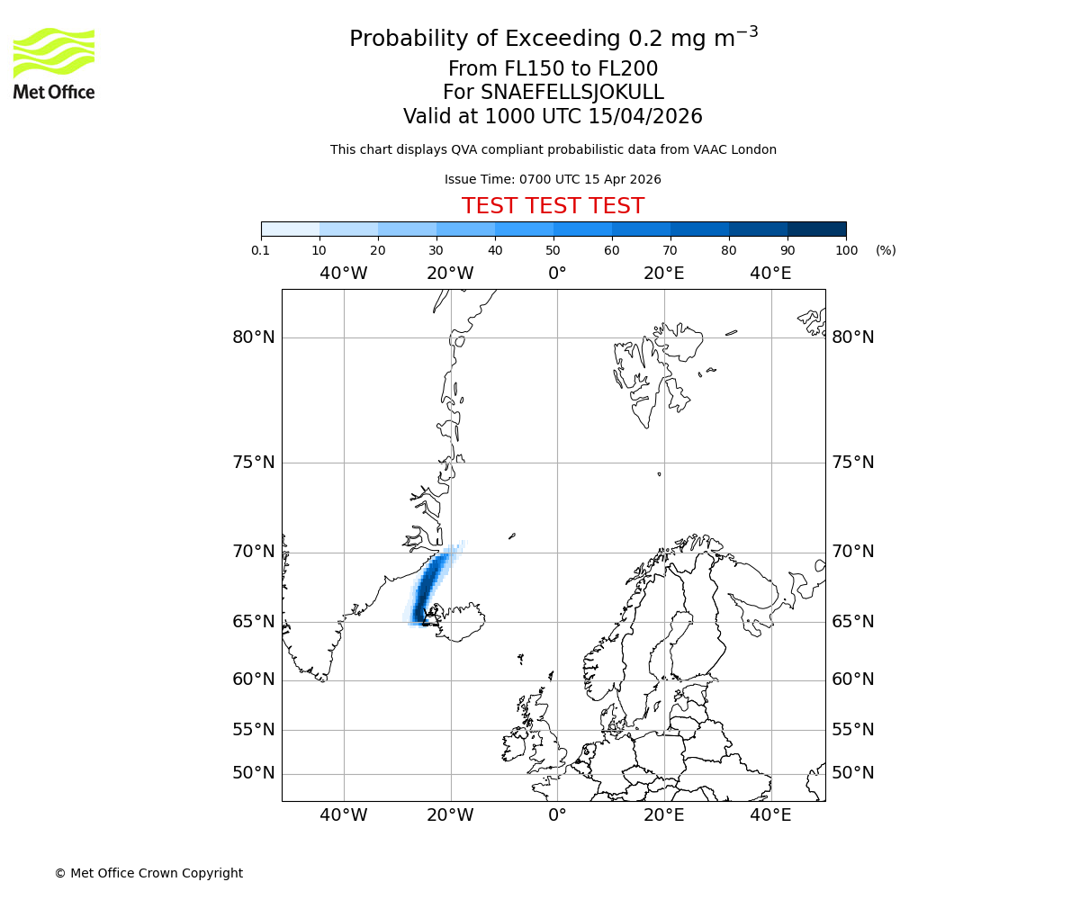 Probability of exceeding 0.2 milligrams per metre cubed. From 150 to 200 for SNAEFELLSJOKULL. Valid at 0700 UTC 15/04/2026