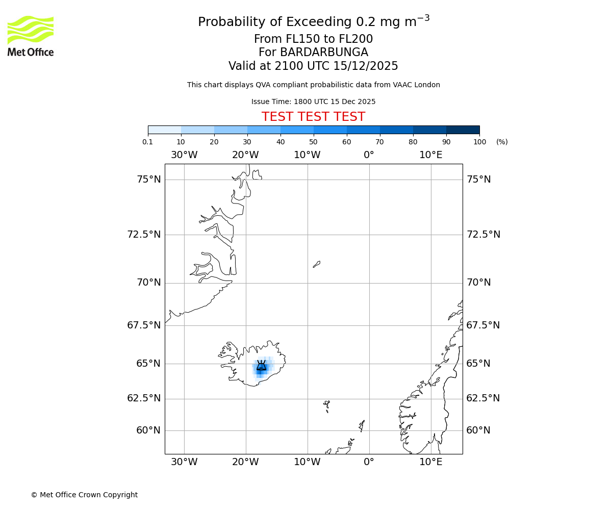 Probability of exceeding 0.2 milligrams per metre cubed. From 150 to 200 for BARDARBUNGA. Valid at 1800 UTC 15/12/2025