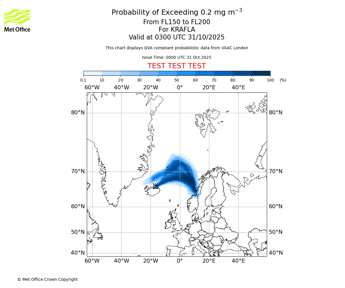 Probability of exceeding 0.2 milligrams per metre cubed. From 150 to 200 for KRAFLA. Valid at 0000 UTC 31/10/2025
