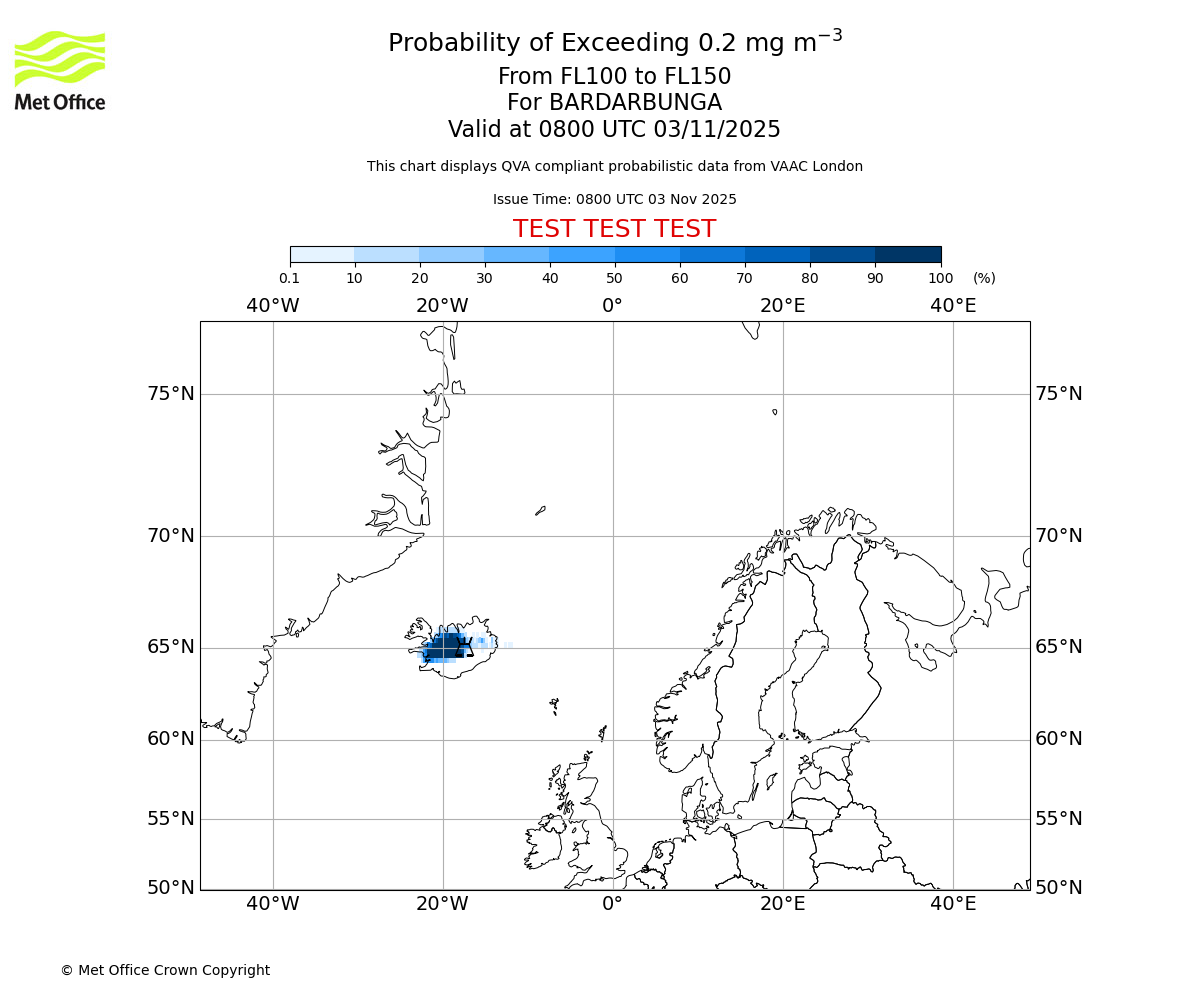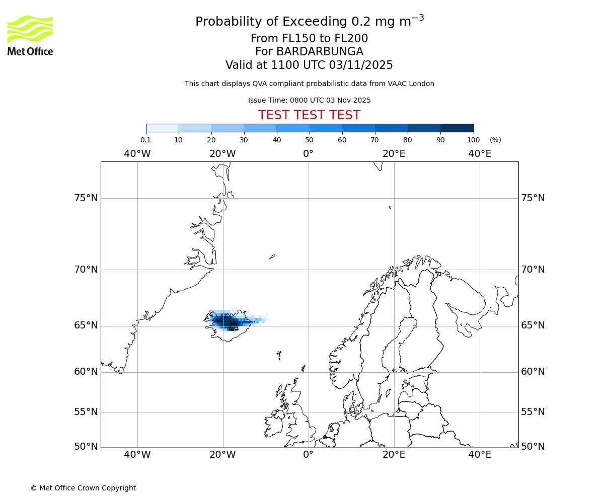 Probability of exceeding 0.2 milligrams per metre cubed. From 150 to 200 for BARDARBUNGA. Valid at 0800 UTC 03/11/2025