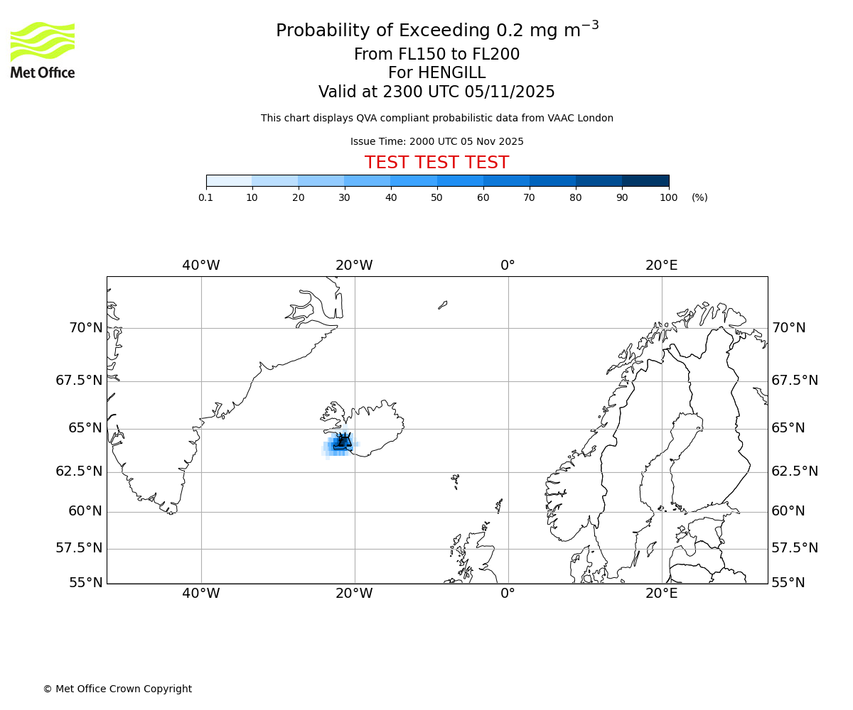 Modelled ash concentration from 000 to 200 for HENGILL. Valid at 2000 UTC 05/11/2025