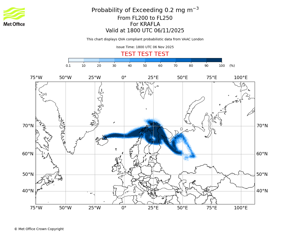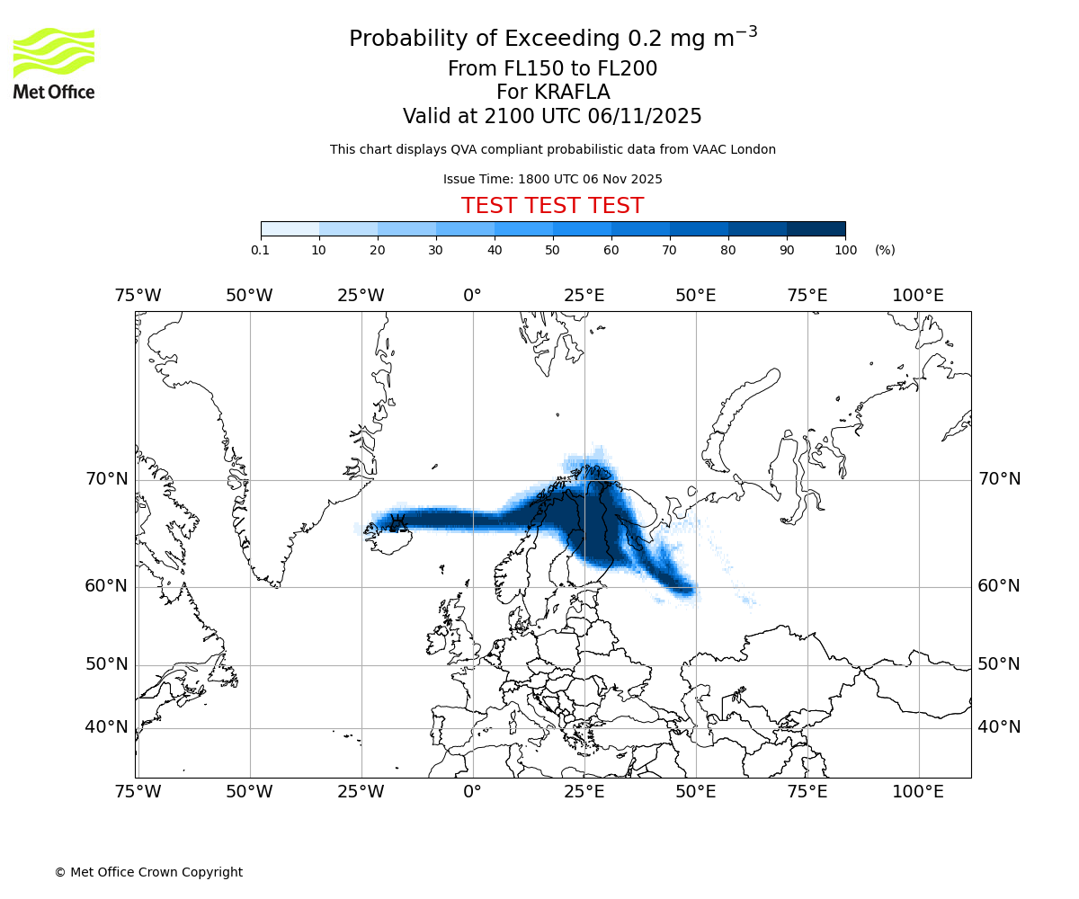 In accordance with ICAO Annex 3, Amendment 82 VAAC London will provide operational QVA forecasts from 27 November 2025 and these will be made available via a VAAC London QVA API information service. These charts are currently provided for test and evaluation purposes (not for operational use) until the introduction of the operational service.
