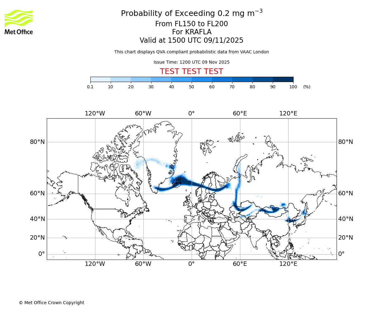 Probability of exceeding 0.2 milligrams per metre cubed. From 150 to 200 for KRAFLA. Valid at 1200 UTC 09/11/2025