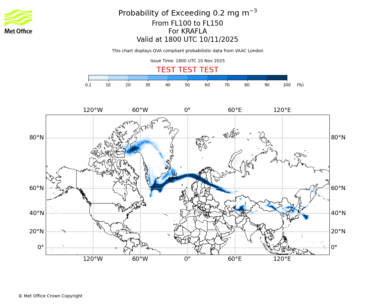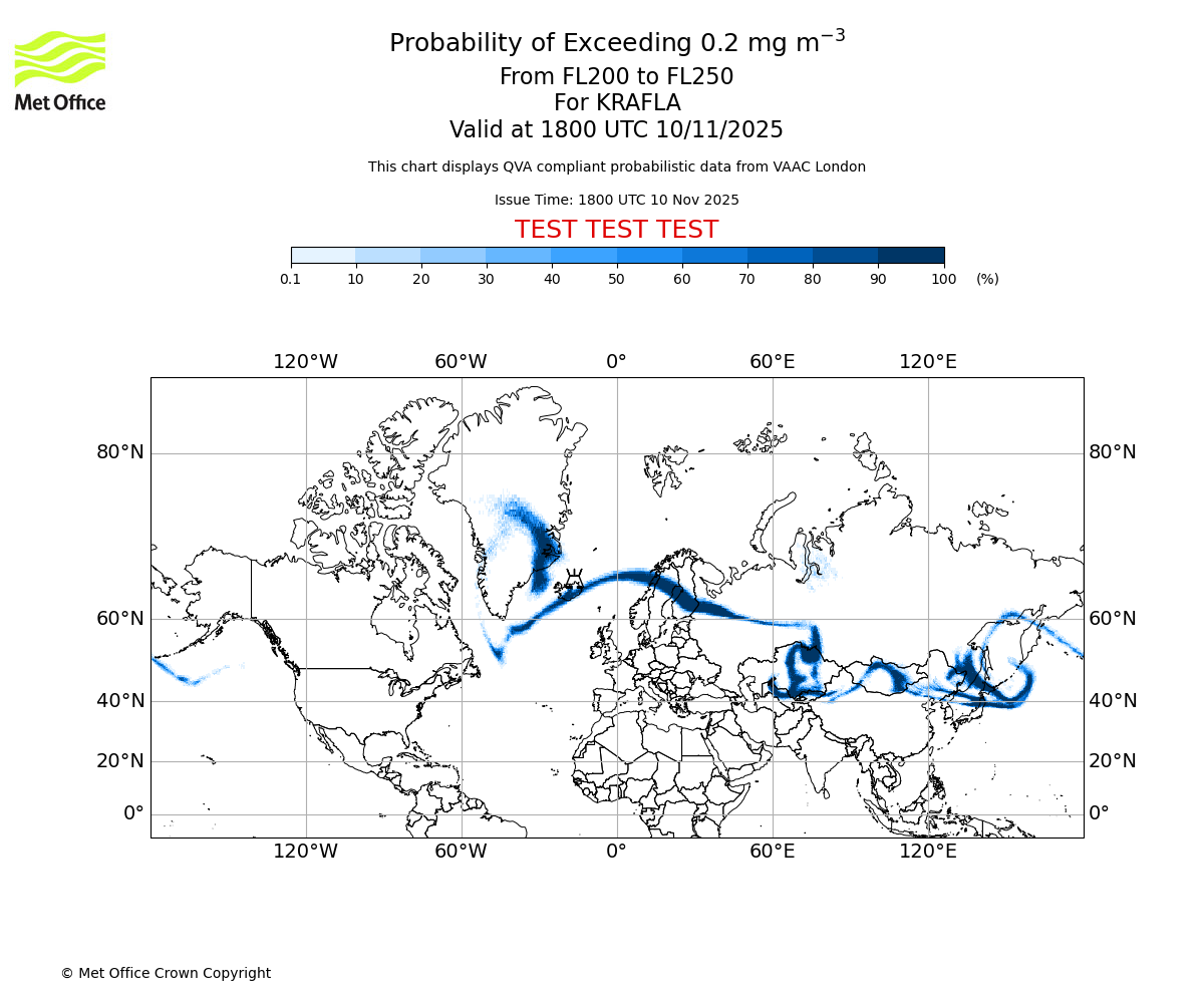 In accordance with ICAO Annex 3, Amendment 82 VAAC London will provide operational QVA forecasts from 27 November 2025 and these will be made available via a VAAC London QVA API information service. These charts are currently provided for test and evaluation purposes (not for operational use) until the introduction of the operational service.