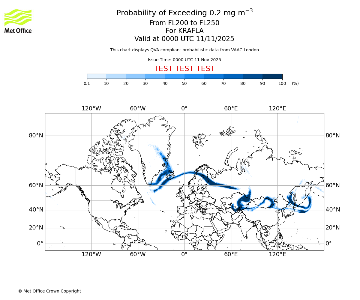 In accordance with ICAO Annex 3, Amendment 82 VAAC London will provide operational QVA forecasts from 27 November 2025 and these will be made available via a VAAC London QVA API information service. These charts are currently provided for test and evaluation purposes (not for operational use) until the introduction of the operational service.