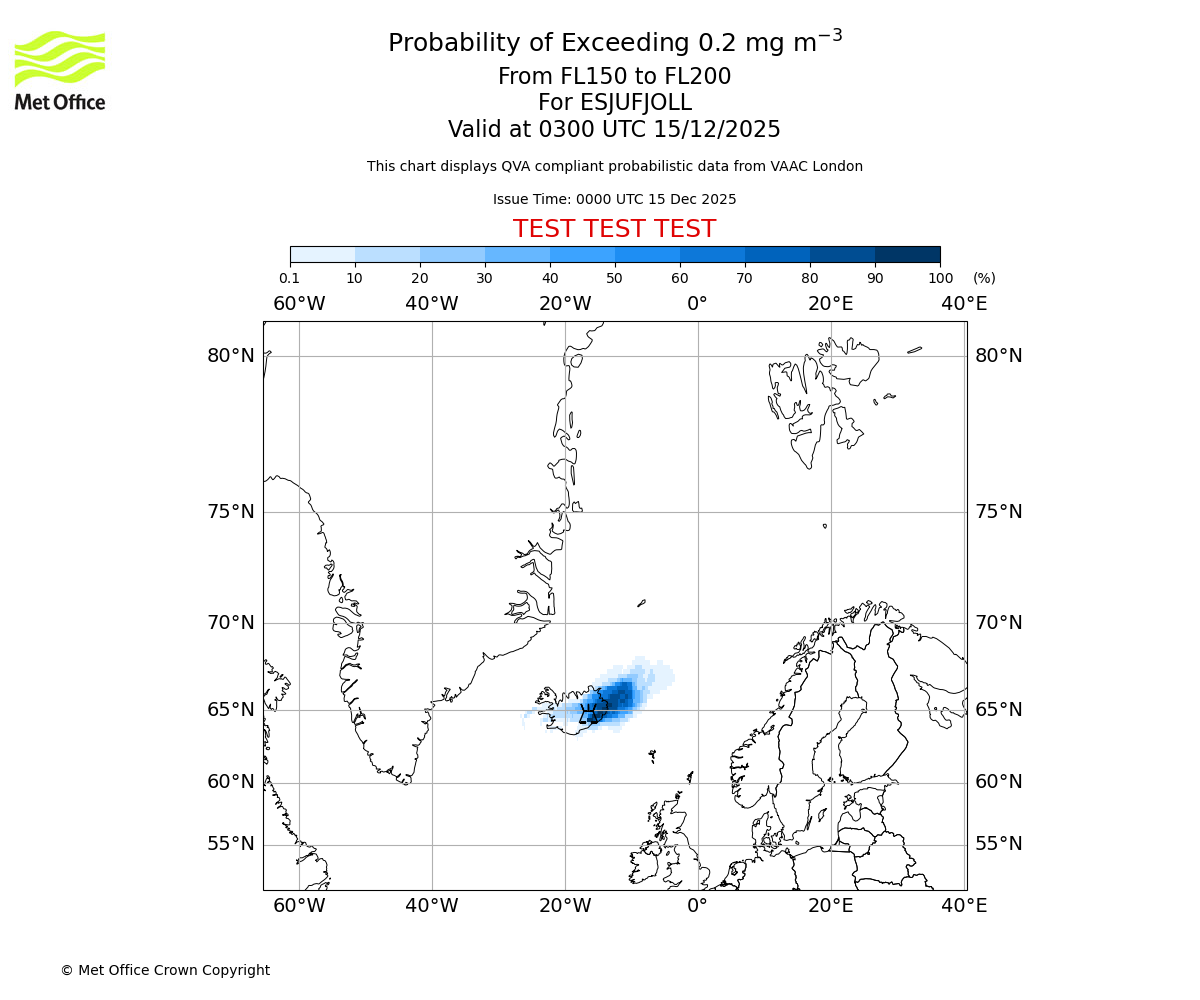 Quantitative Volcanic Ash charts (QVA) are produced in accordance with International Civil Aviation Organization (ICAO) Annex 3 requirements and are provided as well as the London Volcanic Ash Advisory Graphics (VAG) and Advisories (VAA). The lowest QVA threshold (0.2 mg/m³) matches to the areas depicted in the VAA and VAG. Both expected ash concentration and probabilistic forecast information is provided in the chart viewer below for eruptions occurring in the London Volcanic Ash Advisory Centre (VAAC) area of responsibility.