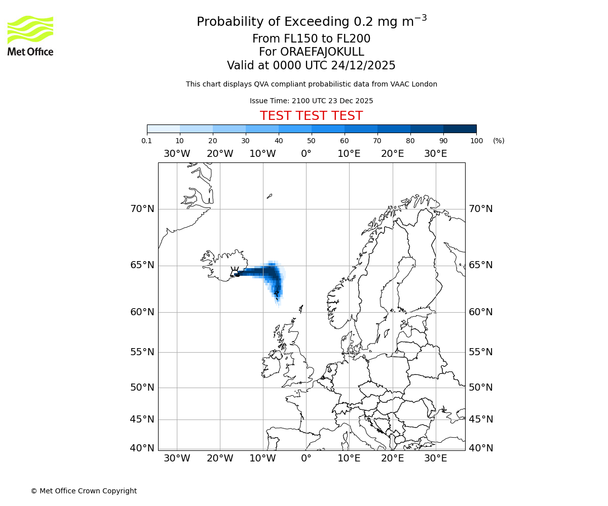 Probability of exceeding 0.2 milligrams per metre cubed. From 150 to 200 for ORAEFAJOKULL. Valid at 2100 UTC 23/12/2025