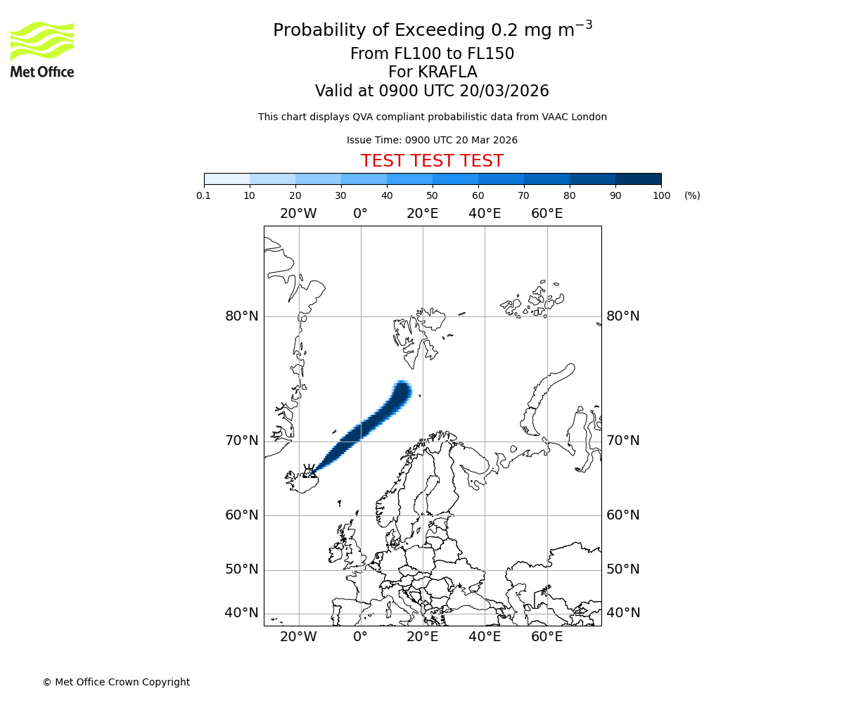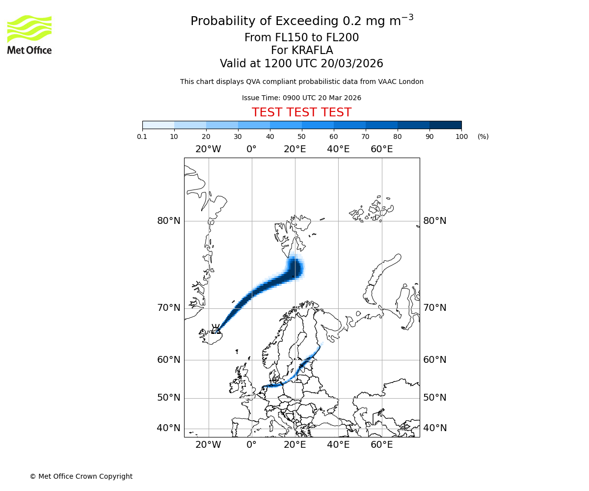 Probability of exceeding 0.2 milligrams per metre cubed. From 150 to 200 for KRAFLA. Valid at 0900 UTC 20/03/2026
