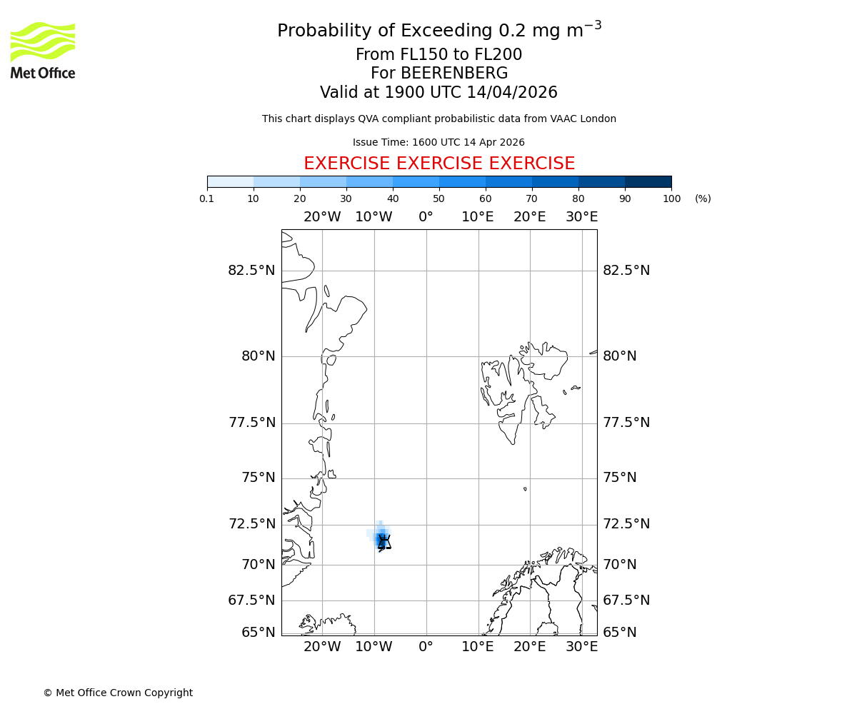 Probability of exceeding 0.2 milligrams per metre cubed. From 150 to 200 for BEERENBERG. Valid at 1600 UTC 14/04/2026