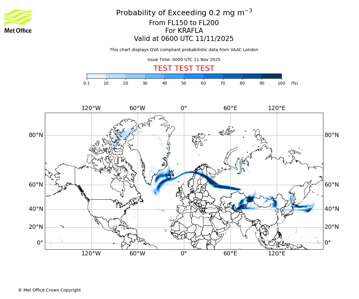 In accordance with ICAO Annex 3, Amendment 82 VAAC London will provide operational QVA forecasts from 27 November 2025 and these will be made available via a VAAC London QVA API information service. These charts are currently provided for test and evaluation purposes (not for operational use) until the introduction of the operational service.