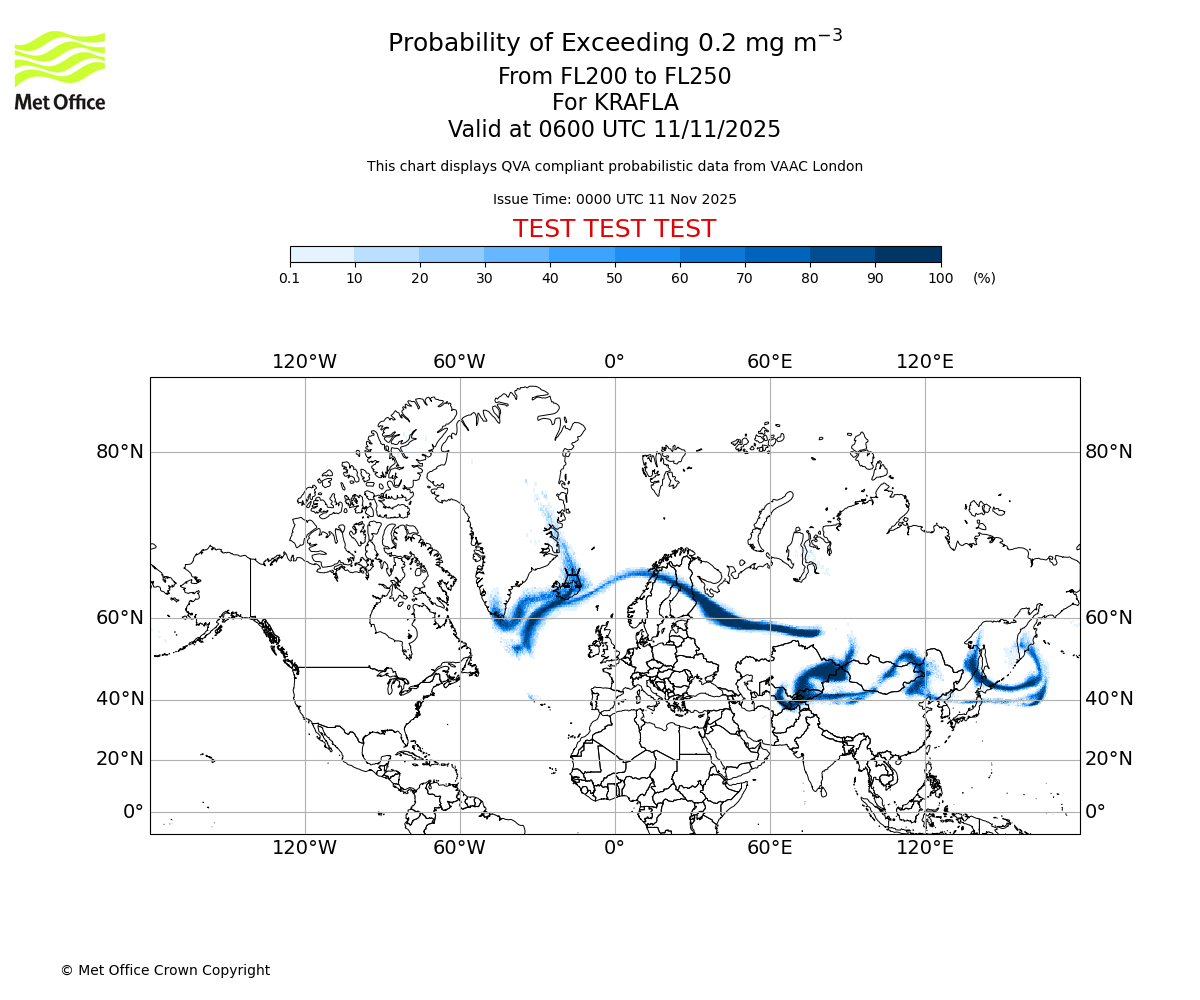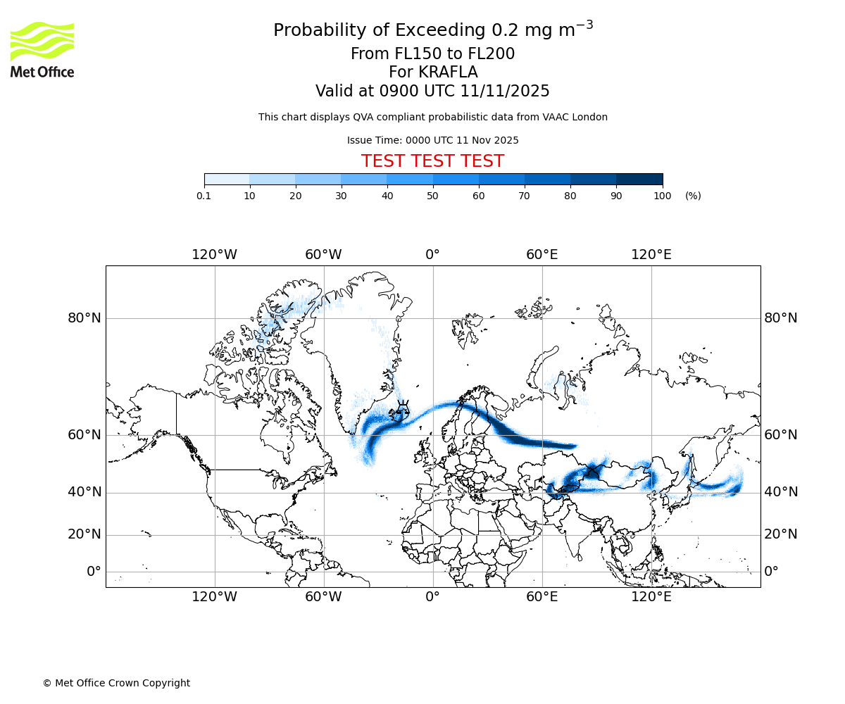 In accordance with ICAO Annex 3, Amendment 82 VAAC London will provide operational QVA forecasts from 27 November 2025 and these will be made available via a VAAC London QVA API information service. These charts are currently provided for test and evaluation purposes (not for operational use) until the introduction of the operational service.