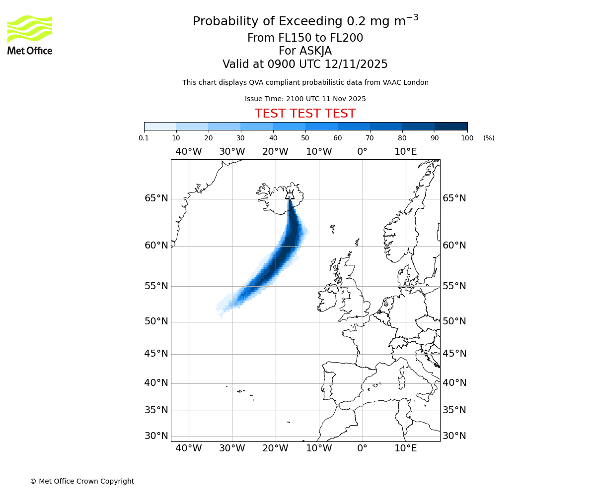 In accordance with ICAO Annex 3, Amendment 82 VAAC London will provide operational QVA forecasts from 27 November 2025 and these will be made available via a VAAC London QVA API information service. These charts are currently provided for test and evaluation purposes (not for operational use) until the introduction of the operational service.