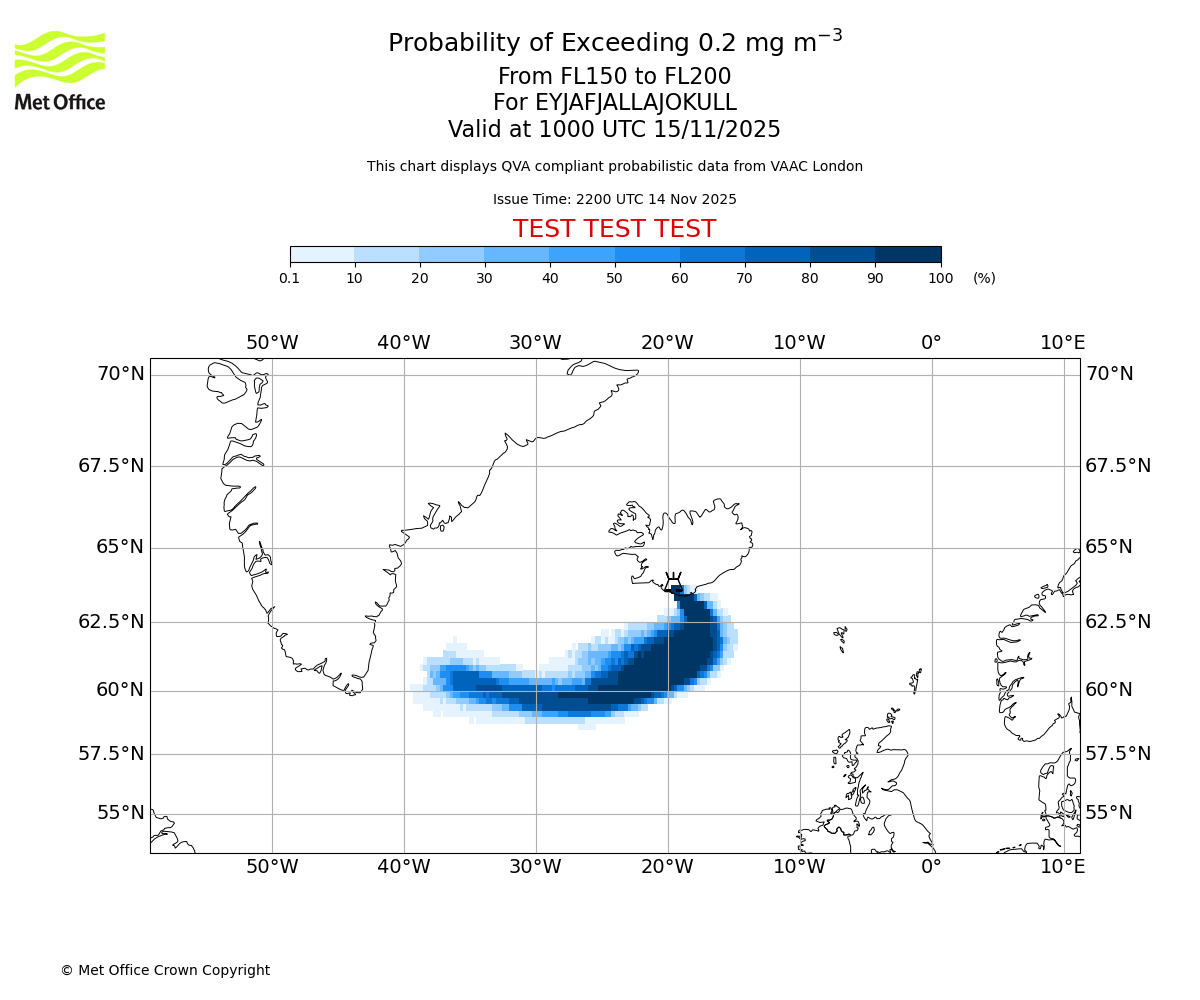 In accordance with ICAO Annex 3, Amendment 82 VAAC London will provide operational QVA forecasts from 27 November 2025 and these will be made available via a VAAC London QVA API information service. These charts are currently provided for test and evaluation purposes (not for operational use) until the introduction of the operational service.