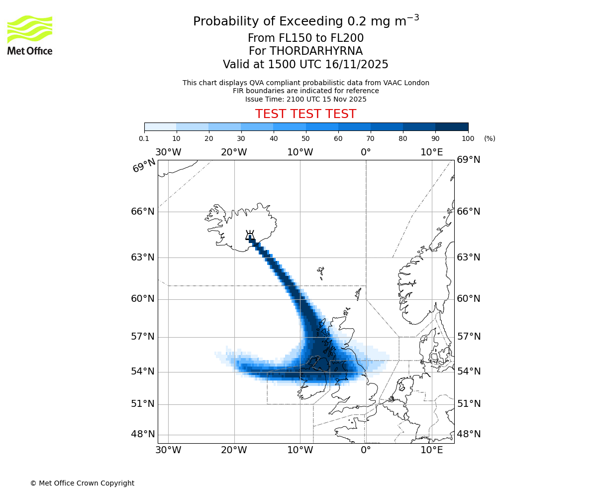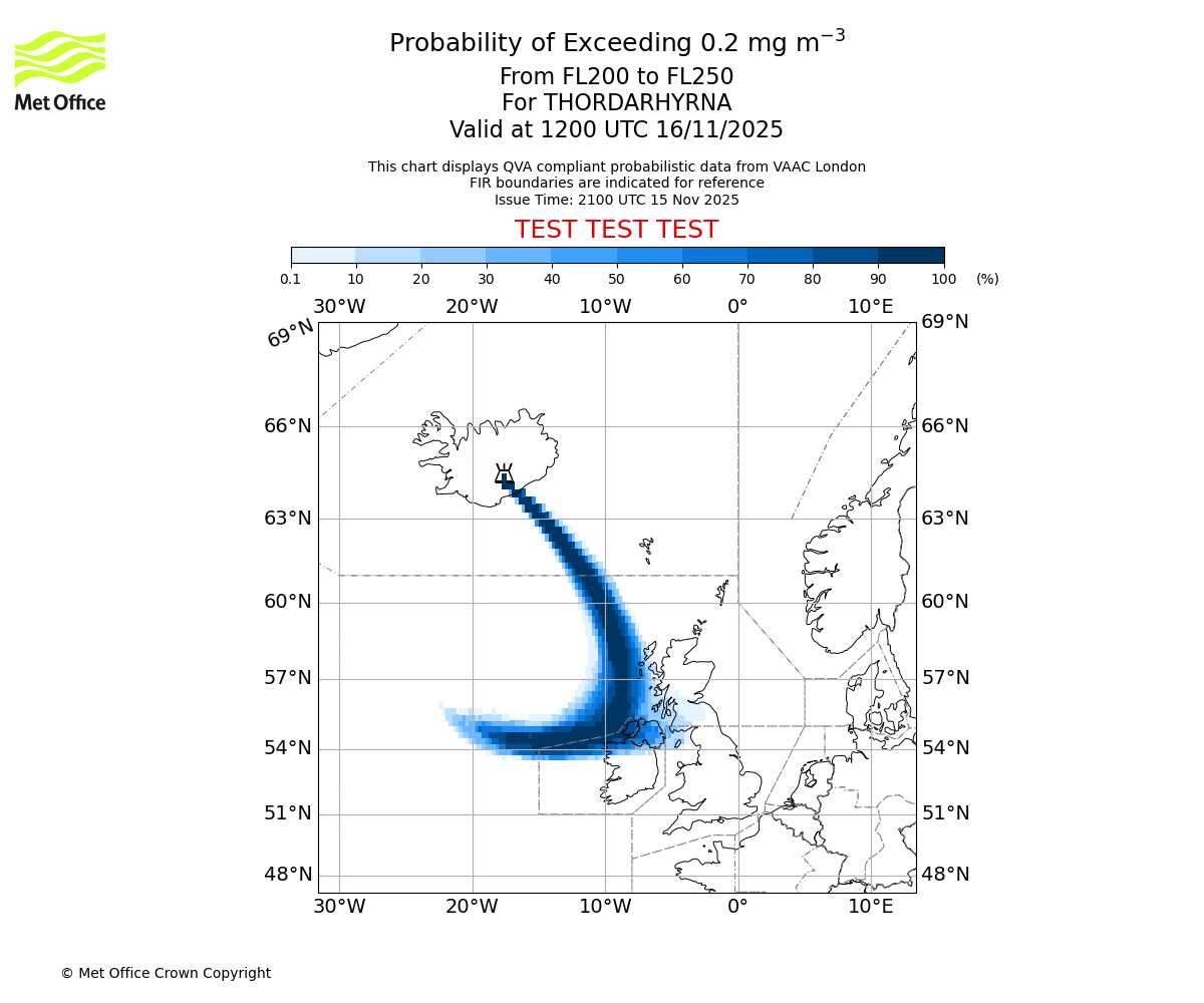 Probability of exceeding 0.2 milligrams per metre cubed. From 150 to 200 for THORDARHYRNA. Valid at 1200 UTC 16/11/2025