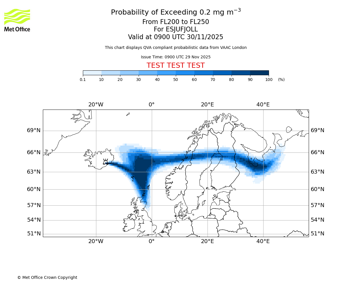 Quantitative Volcanic Ash charts (QVA) are produced in accordance with International Civil Aviation Organization (ICAO) Annex 3 requirements and are provided as well as the London Volcanic Ash Advisory Graphics (VAG) and Advisories (VAA). The lowest QVA threshold (0.2 mg/m³) matches to the areas depicted in the VAA and VAG. Both expected ash concentration and probabilistic forecast information is provided in the chart viewer below for eruptions occurring in the London Volcanic Ash Advisory Centre (VAAC) area of responsibility.