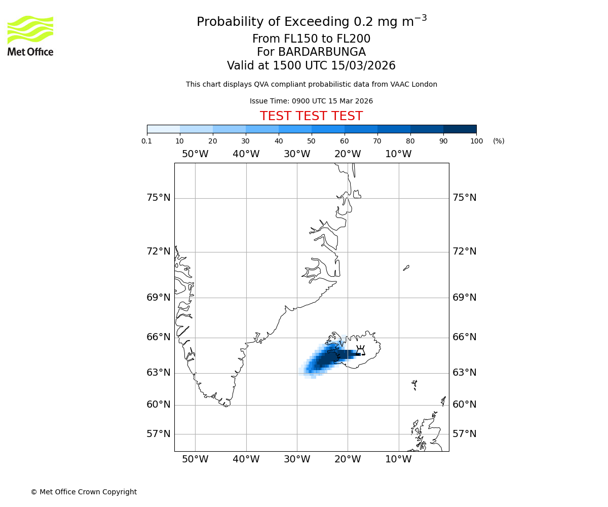 Probability of exceeding 0.2 milligrams per metre cubed. From 150 to 200 for BARDARBUNGA. Valid at 1200 UTC 15/03/2026