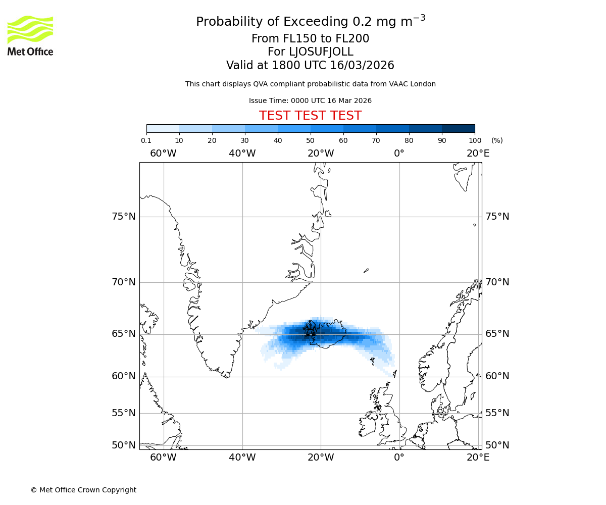 Modelled ash concentration from 000 to 200 for LJOSUFJOLL. Valid at 0000 UTC 16/03/2026