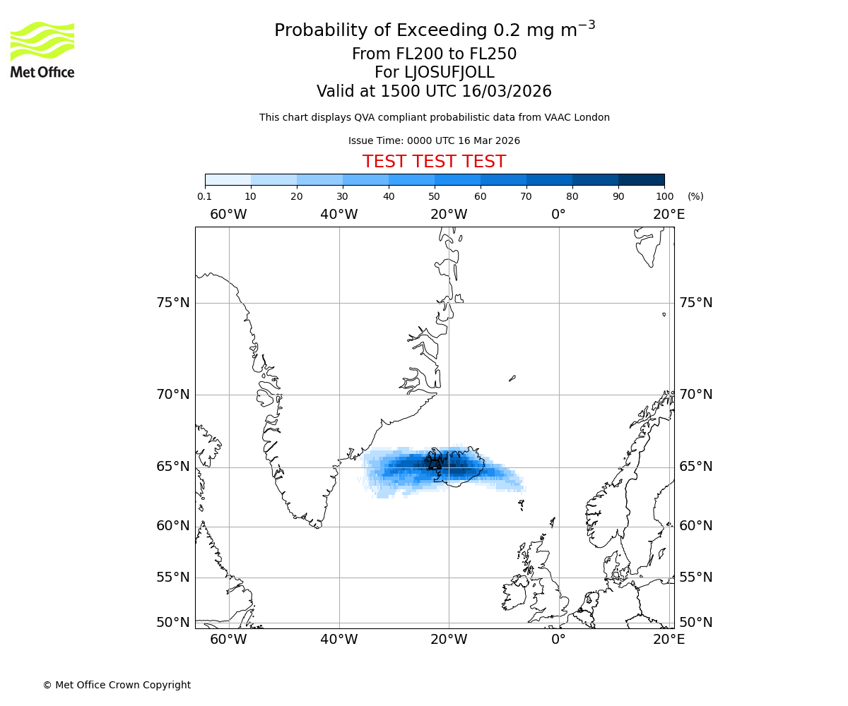 Quantitative Volcanic Ash charts (QVA) are produced in accordance with International Civil Aviation Organization (ICAO) Annex 3 requirements and are provided as well as the London Volcanic Ash Advisory Graphics (VAG) and Advisories (VAA). The lowest QVA threshold (0.2 mg/m³) matches to the areas depicted in the VAA and VAG. Both expected ash concentration and probabilistic forecast information is provided in the chart viewer below for eruptions occurring in the London Volcanic Ash Advisory Centre (VAAC) area of responsibility.