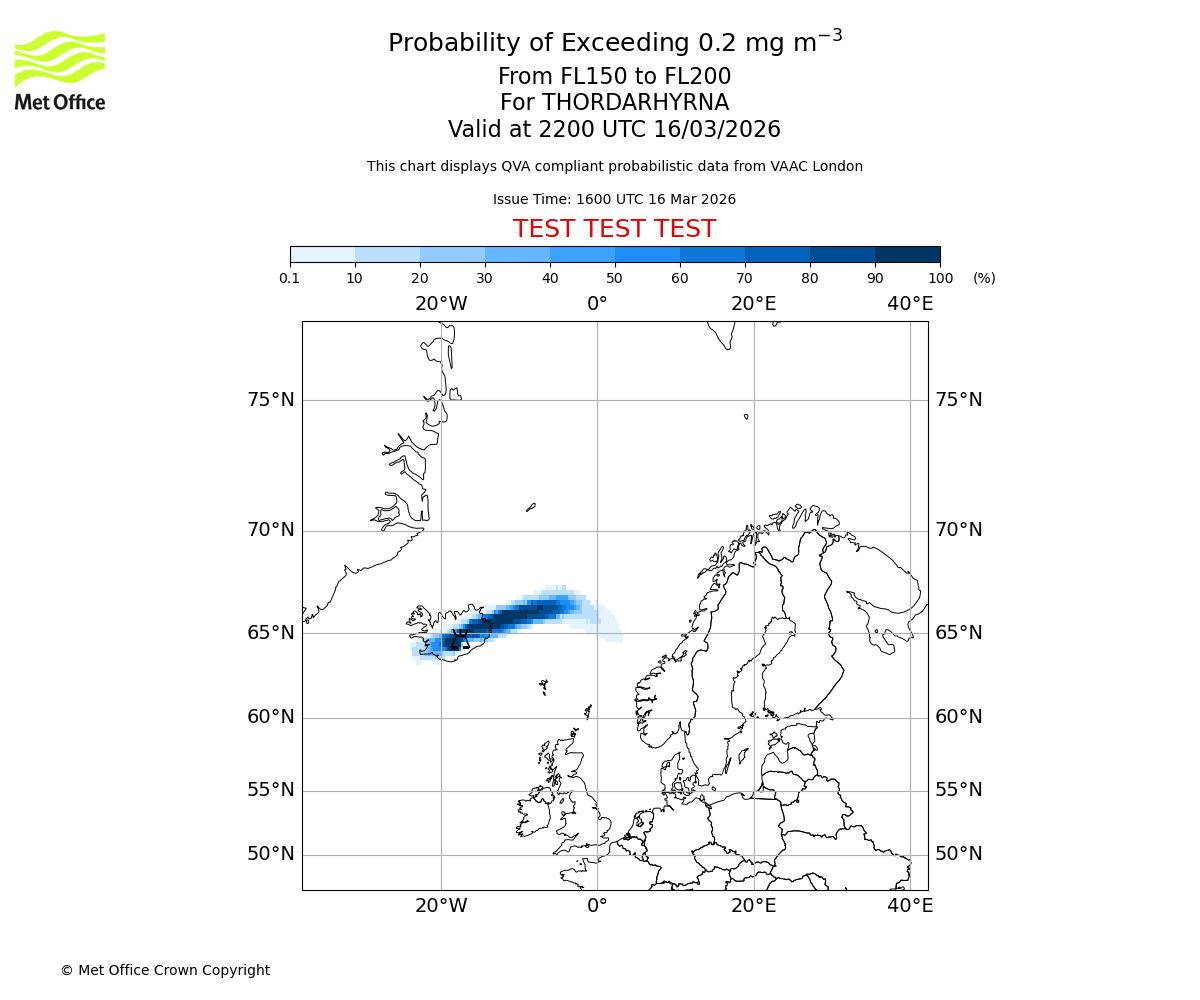 Probability of exceeding 0.2 milligrams per metre cubed. From 150 to 200 for THORDARHYRNA. Valid at 1900 UTC 16/03/2026