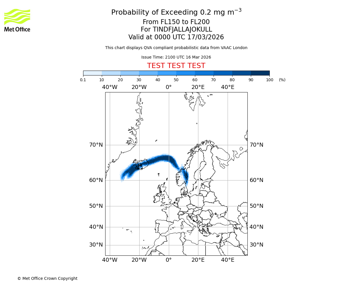 Modelled ash concentration from 000 to 200 for TINDFJALLAJOKULL. Valid at 2100 UTC 16/03/2026