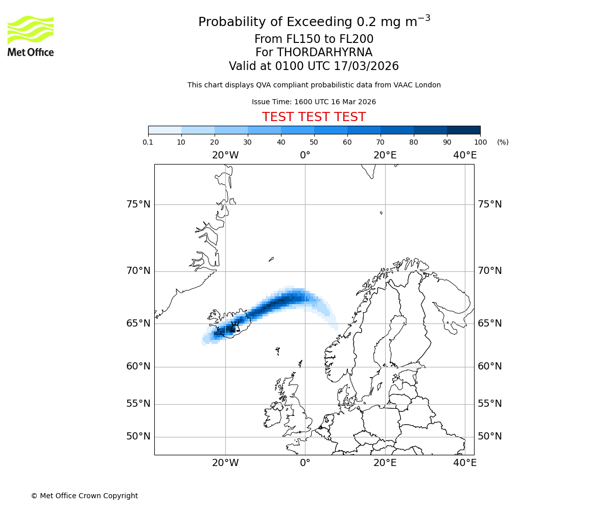 Probability of exceeding 0.2 milligrams per metre cubed. From 150 to 200 for THORDARHYRNA. Valid at 2200 UTC 16/03/2026