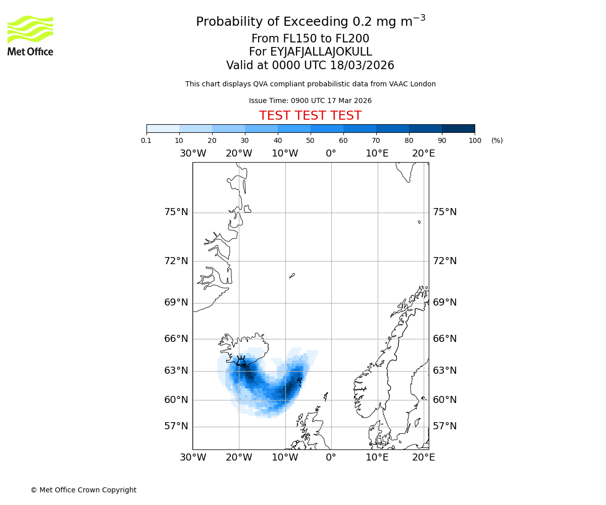 Probability of exceeding 0.2 milligrams per metre cubed. From 150 to 200 for EYJAFJALLAJOKULL. Valid at 2100 UTC 17/03/2026