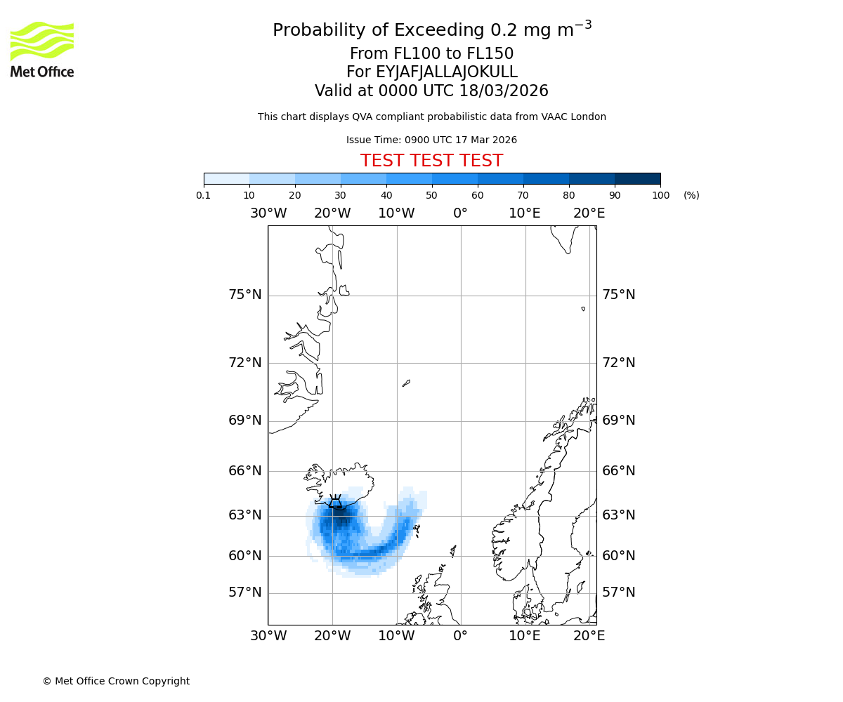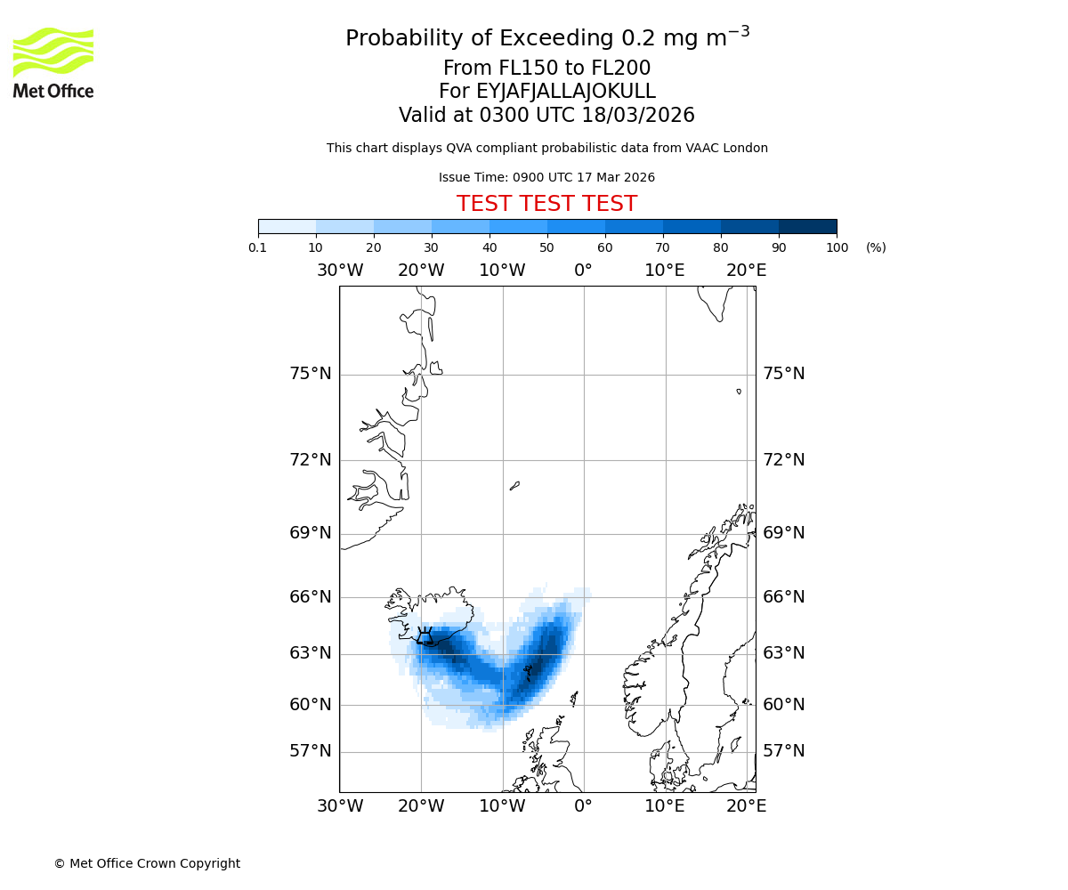 Probability of exceeding 0.2 milligrams per metre cubed. From 150 to 200 for EYJAFJALLAJOKULL. Valid at 0000 UTC 18/03/2026