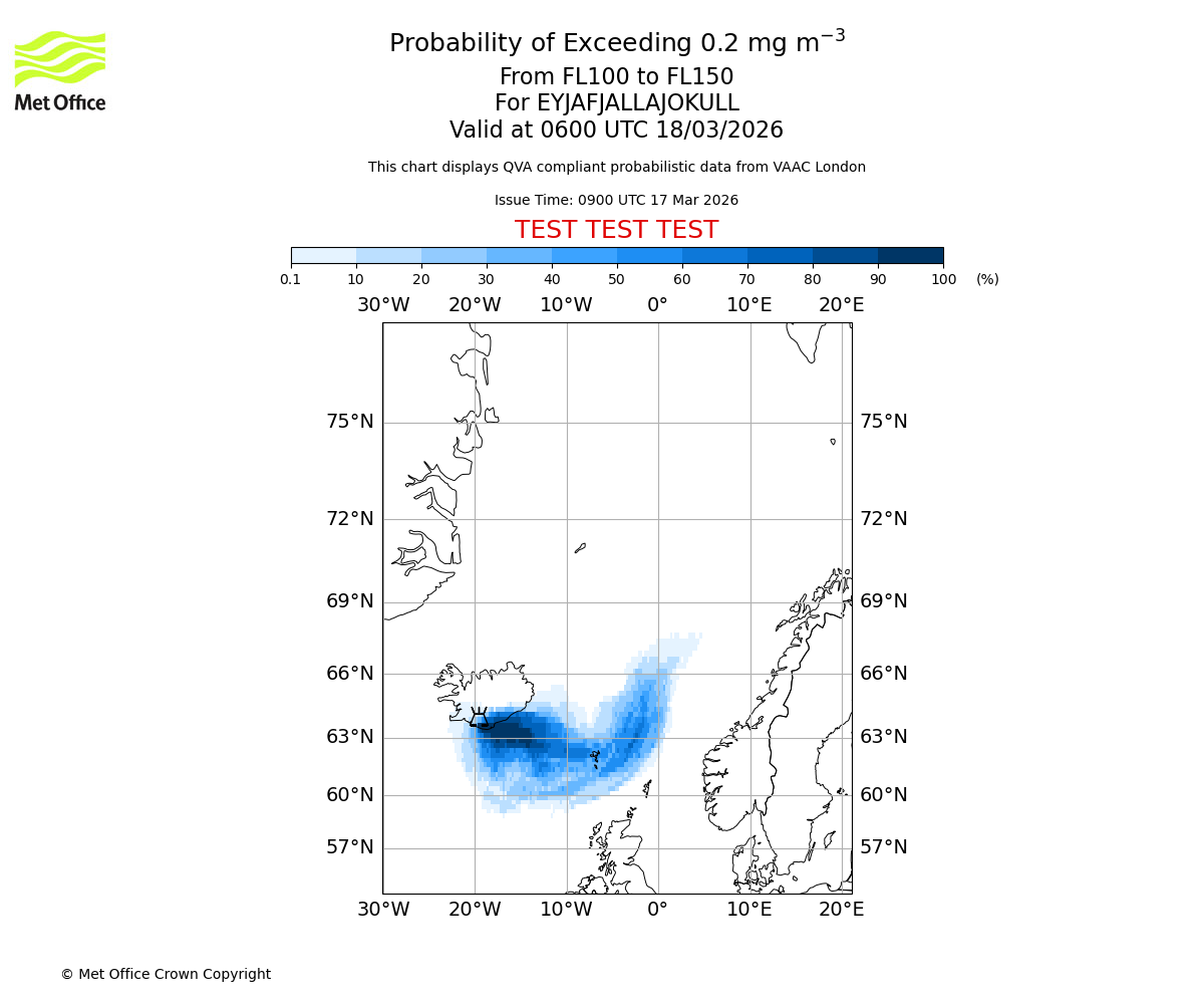 Probability of exceeding 0.2 milligrams per metre cubed. From 150 to 200 for EYJAFJALLAJOKULL. Valid at 0600 UTC 18/03/2026