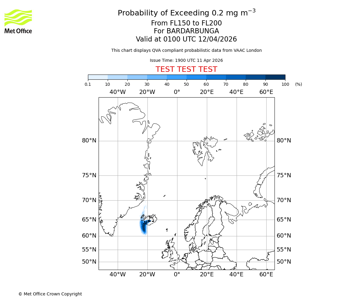 Modelled ash concentration from 000 to 200 for BARDARBUNGA. Valid at 1900 UTC 11/04/2026