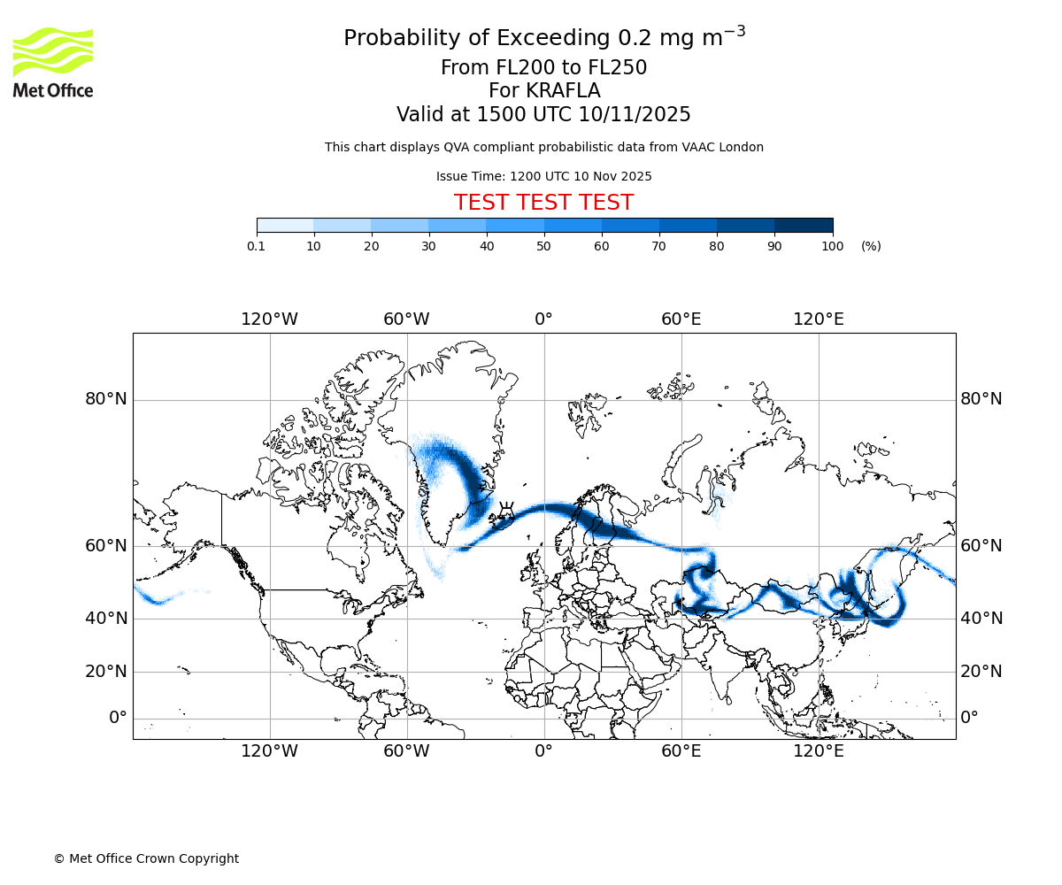 In accordance with ICAO Annex 3, Amendment 82 VAAC London will provide operational QVA forecasts from 27 November 2025 and these will be made available via a VAAC London QVA API information service. These charts are currently provided for test and evaluation purposes (not for operational use) until the introduction of the operational service.
