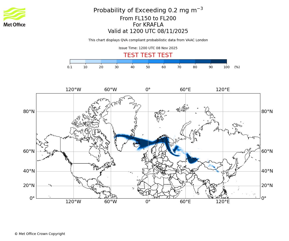 Probability of exceeding 0.2 milligrams per metre cubed. From 200 to 250 for KRAFLA. Valid at 1200 UTC 08/11/2025