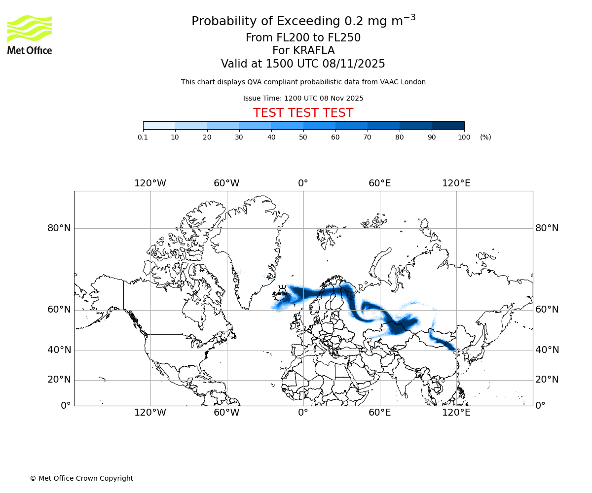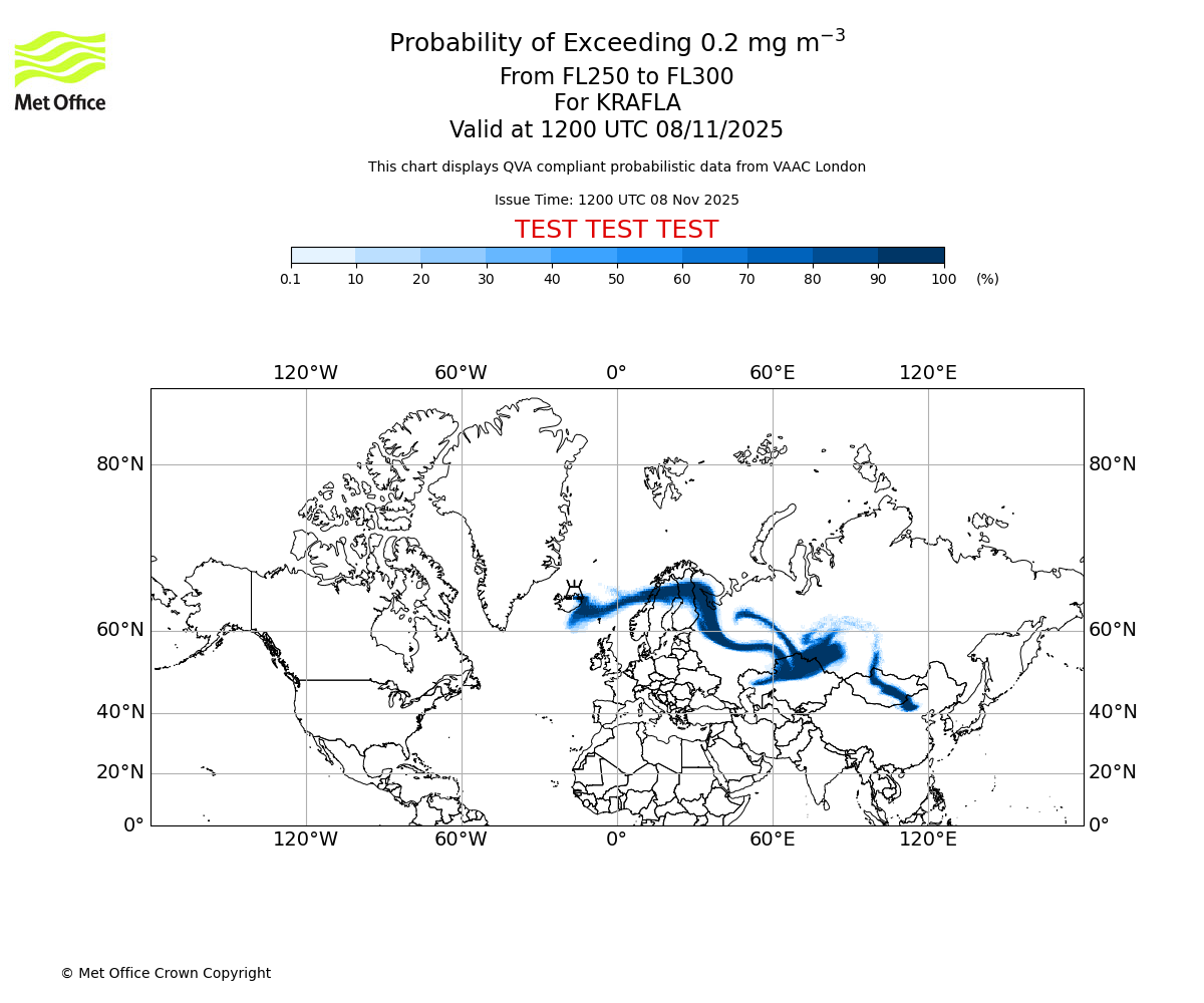 In accordance with ICAO Annex 3, Amendment 82 VAAC London will provide operational QVA forecasts from 27 November 2025 and these will be made available via a VAAC London QVA API information service. These charts are currently provided for test and evaluation purposes (not for operational use) until the introduction of the operational service.