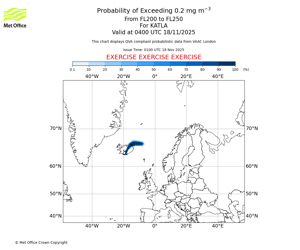 Probability of exceeding 0.2 milligrams per metre cubed. From 200 to 250 for KATLA. Valid at 0100 UTC 18/11/2025