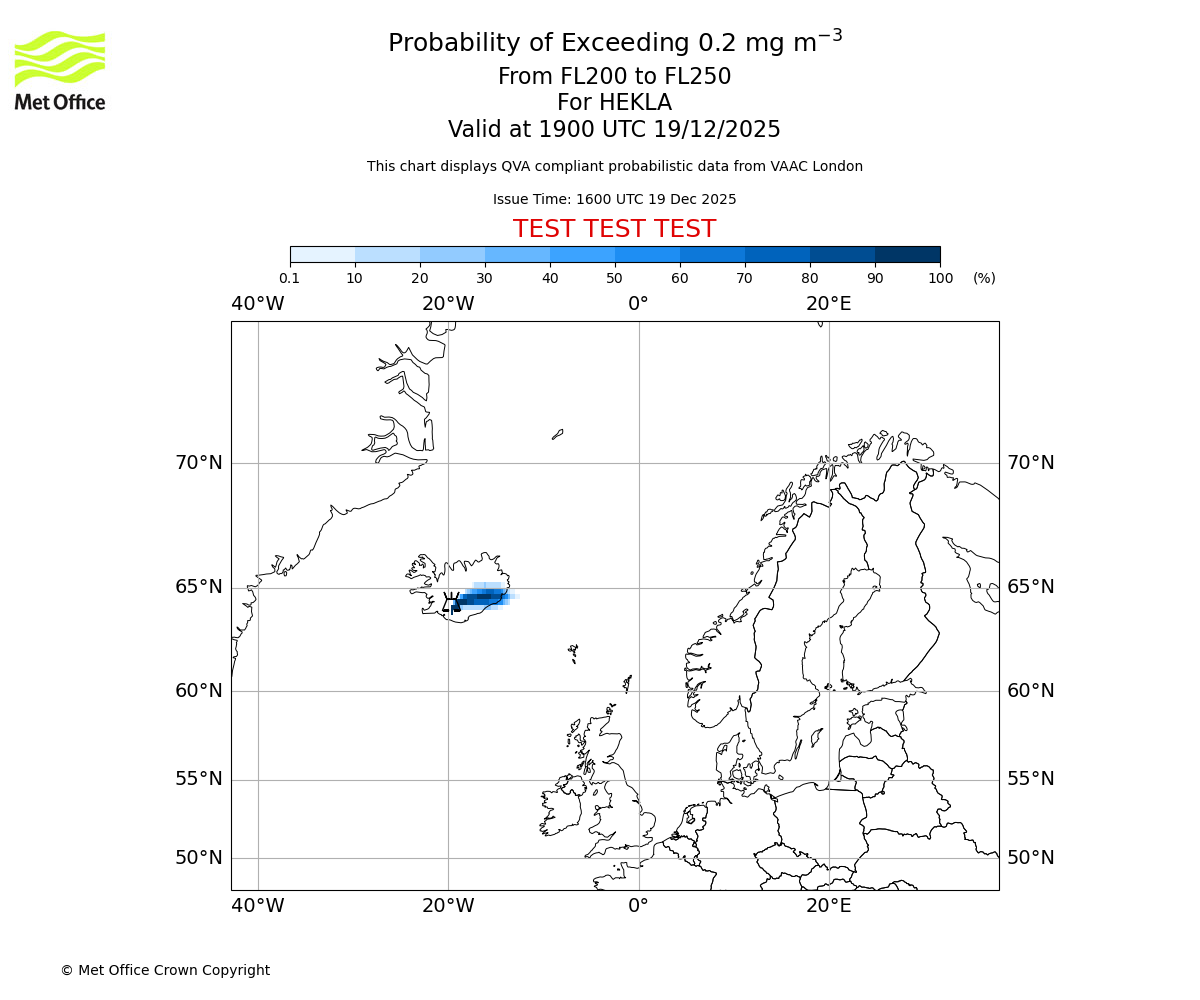 Probability of exceeding 0.2 milligrams per metre cubed. From 200 to 250 for HEKLA. Valid at 1600 UTC 19/12/2025