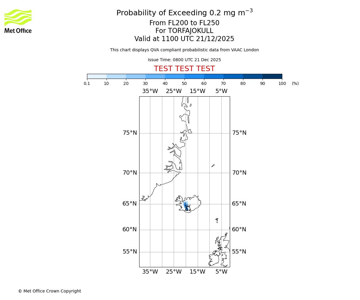 Probability of exceeding 0.2 milligrams per metre cubed. From 200 to 250 for TORFAJOKULL. Valid at 0800 UTC 21/12/2025