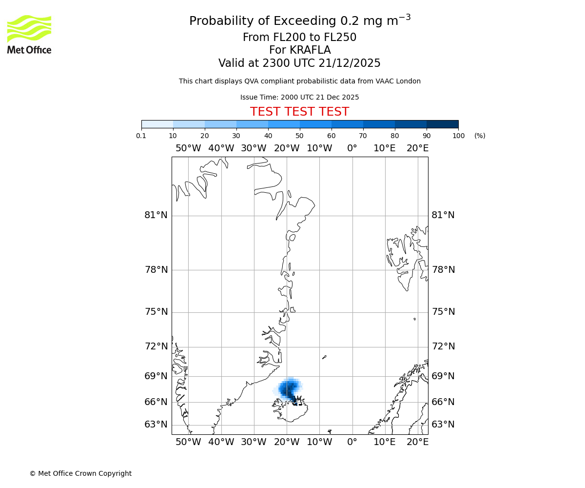 Quantitative Volcanic Ash charts (QVA) are produced in accordance with International Civil Aviation Organization (ICAO) Annex 3 requirements and are provided as well as the London Volcanic Ash Advisory Graphics (VAG) and Advisories (VAA). The lowest QVA threshold (0.2 mg/m³) matches to the areas depicted in the VAA and VAG. Both expected ash concentration and probabilistic forecast information is provided in the chart viewer below for eruptions occurring in the London Volcanic Ash Advisory Centre (VAAC) area of responsibility.