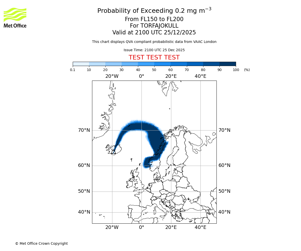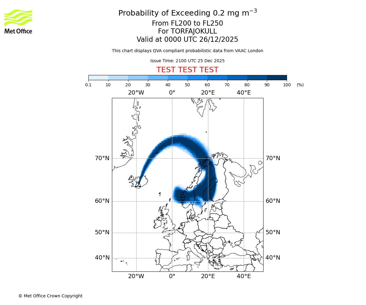 Probability of exceeding 0.2 milligrams per metre cubed. From 200 to 250 for TORFAJOKULL. Valid at 2100 UTC 25/12/2025