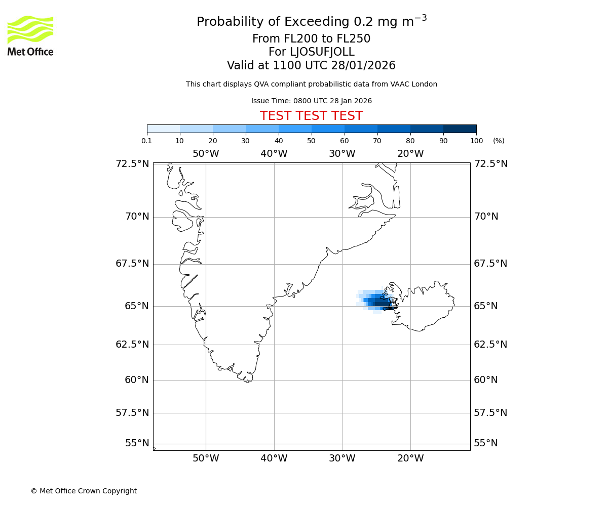 Modelled ash concentration from 000 to 200 for LJOSUFJOLL. Valid at 0800 UTC 28/01/2026