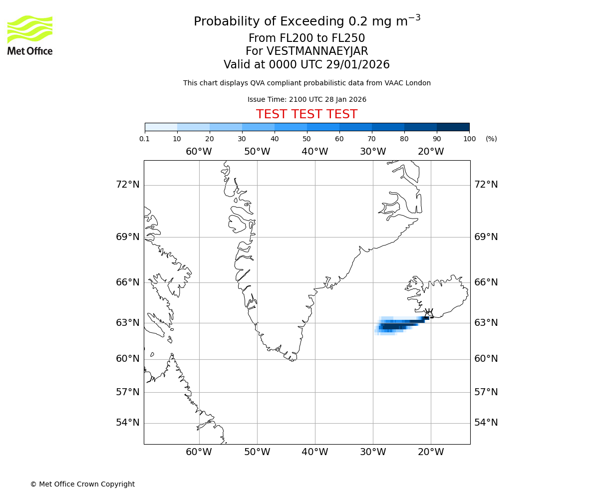 Probability of exceeding 0.2 milligrams per metre cubed. From 200 to 250 for VESTMANNAEYJAR. Valid at 2100 UTC 28/01/2026