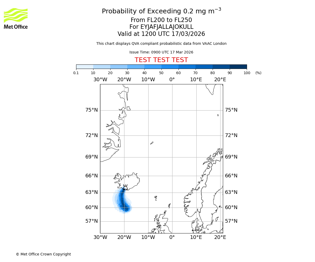 Probability of exceeding 0.2 milligrams per metre cubed. From 200 to 250 for EYJAFJALLAJOKULL. Valid at 0900 UTC 17/03/2026
