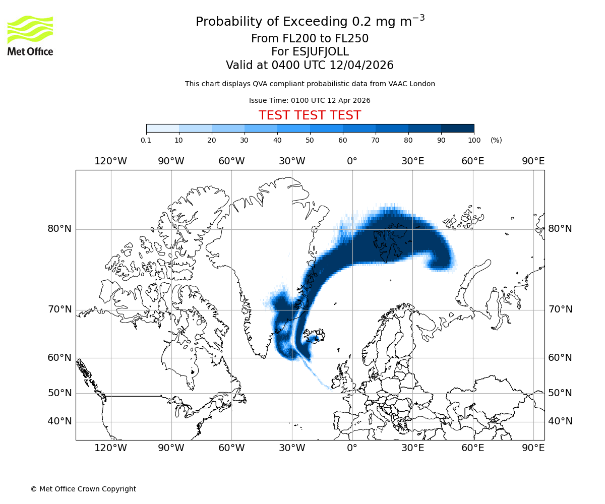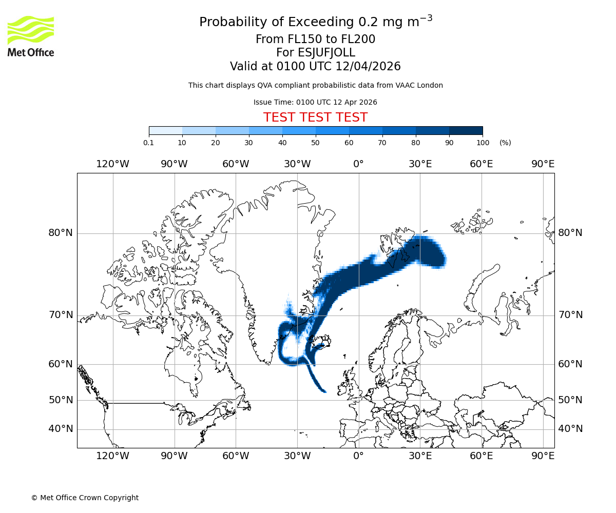 Quantitative Volcanic Ash charts (QVA) are produced in accordance with International Civil Aviation Organization (ICAO) Annex 3 requirements and are provided as well as the London Volcanic Ash Advisory Graphics (VAG) and Advisories (VAA). The lowest QVA threshold (0.2 mg/m³) matches to the areas depicted in the VAA and VAG. Both expected ash concentration and probabilistic forecast information is provided in the chart viewer below for eruptions occurring in the London Volcanic Ash Advisory Centre (VAAC) area of responsibility.