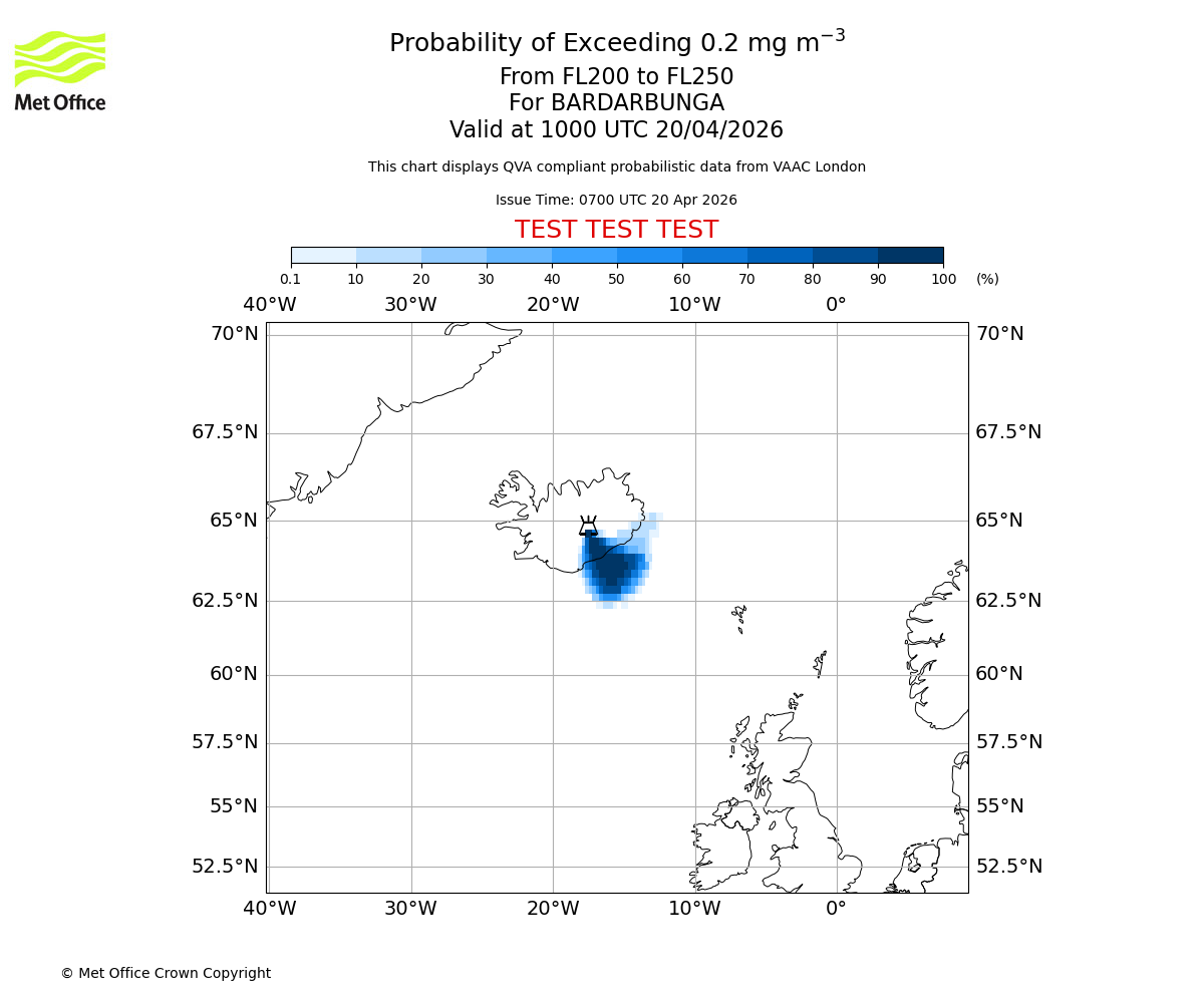 Probability of exceeding 0.2 milligrams per metre cubed. From 200 to 250 for BARDARBUNGA. Valid at 0700 UTC 20/04/2026