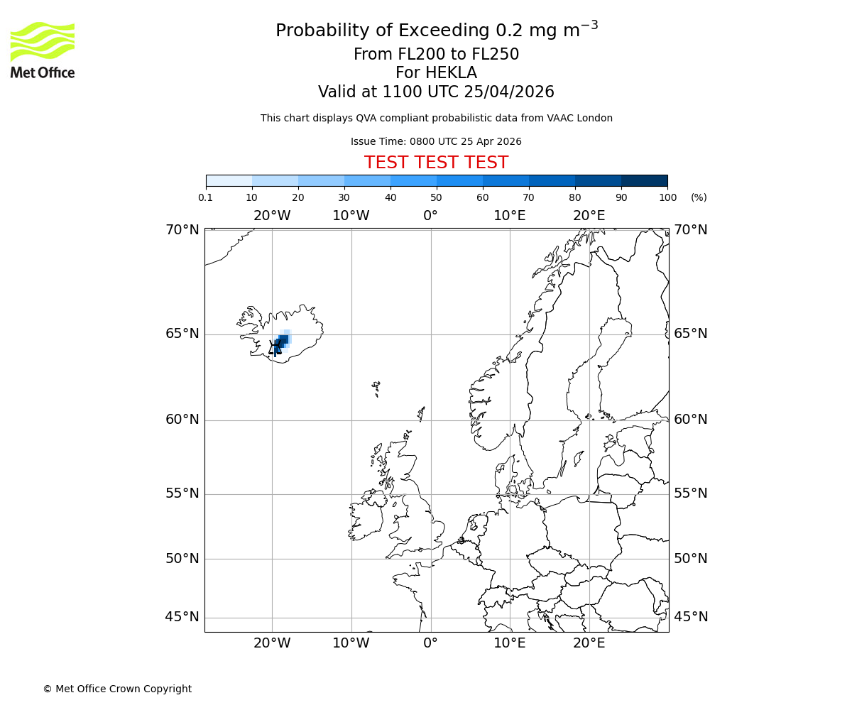Probability of exceeding 0.2 milligrams per metre cubed. From 200 to 250 for HEKLA. Valid at 0800 UTC 25/04/2026