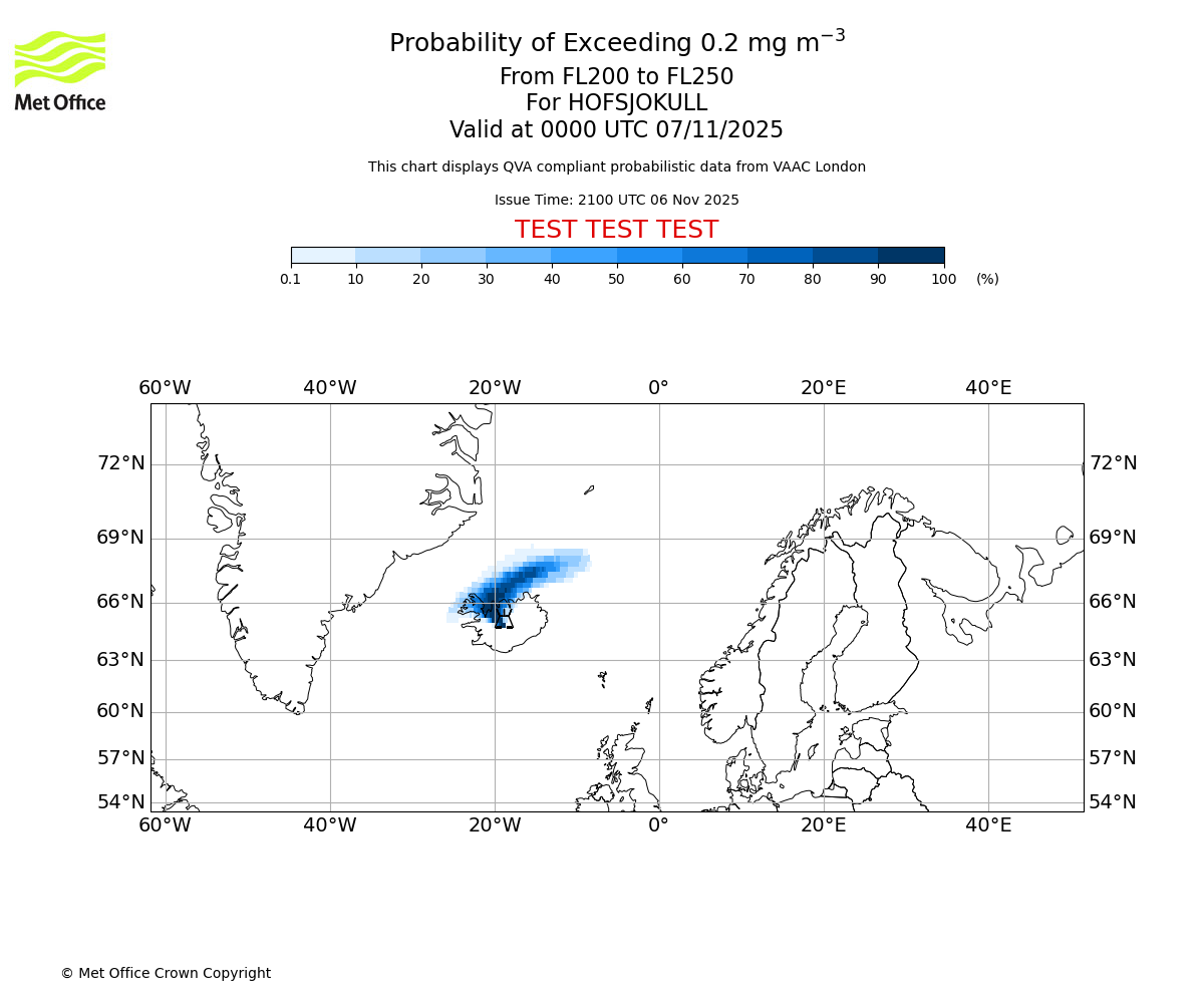 In accordance with ICAO Annex 3, Amendment 82 VAAC London will provide operational QVA forecasts from 27 November 2025 and these will be made available via a VAAC London QVA API information service. These charts are currently provided for test and evaluation purposes (not for operational use) until the introduction of the operational service.