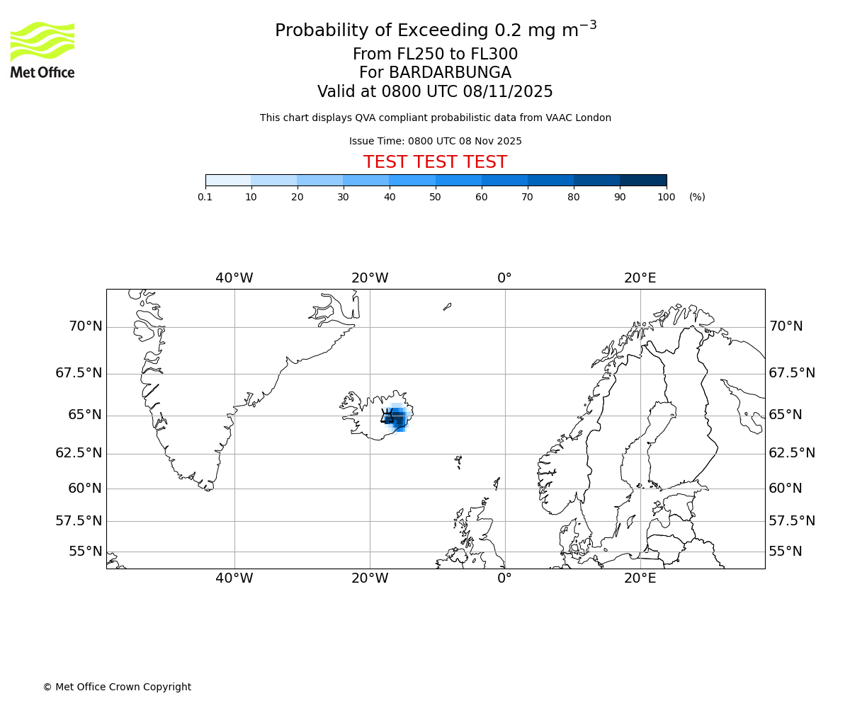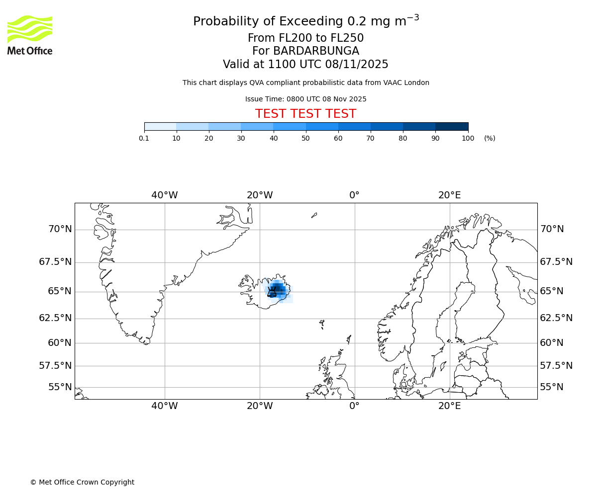 Probability of exceeding 0.2 milligrams per metre cubed. From 200 to 250 for BARDARBUNGA. Valid at 0800 UTC 08/11/2025