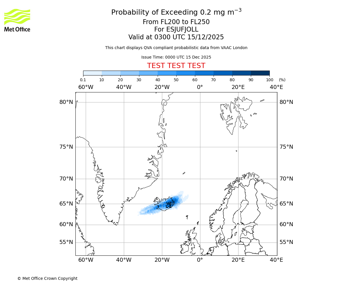 Quantitative Volcanic Ash charts (QVA) are produced in accordance with International Civil Aviation Organization (ICAO) Annex 3 requirements and are provided as well as the London Volcanic Ash Advisory Graphics (VAG) and Advisories (VAA). The lowest QVA threshold (0.2 mg/m³) matches to the areas depicted in the VAA and VAG. Both expected ash concentration and probabilistic forecast information is provided in the chart viewer below for eruptions occurring in the London Volcanic Ash Advisory Centre (VAAC) area of responsibility.
